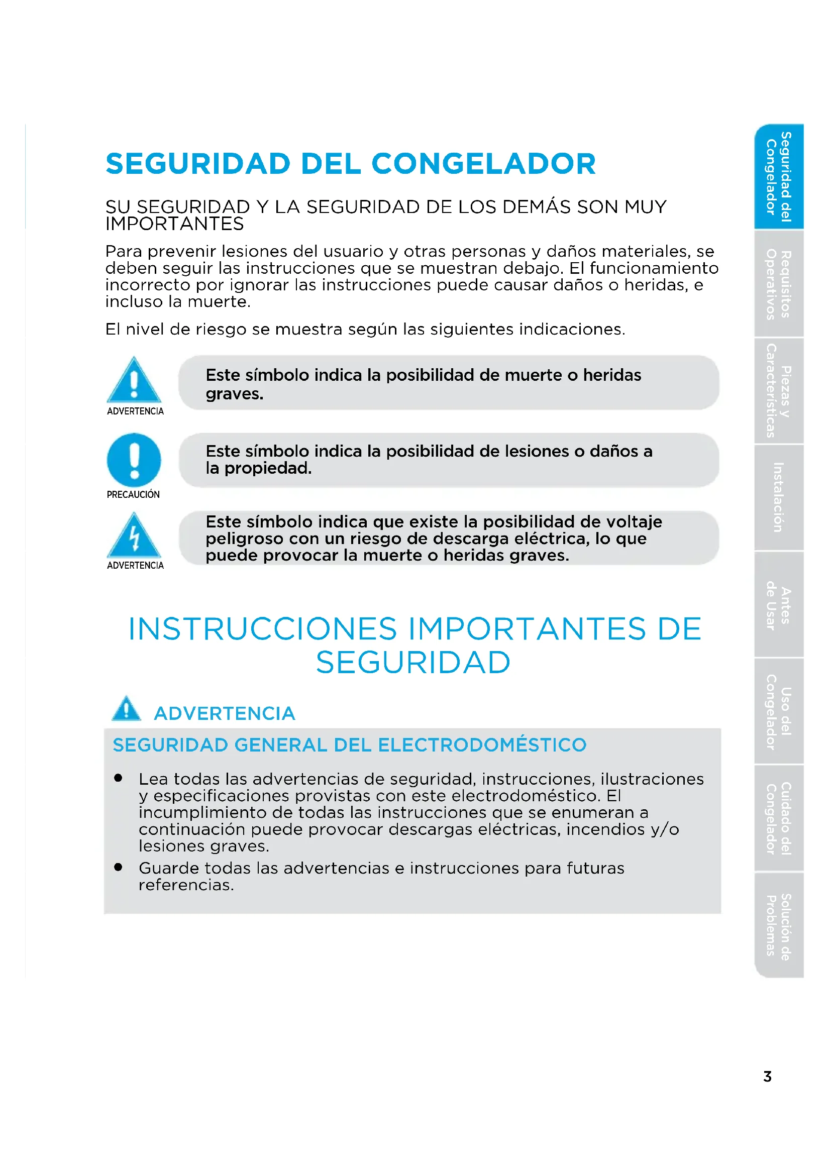 Seguridad del CongeladorRequisitos OperativosPiezas y CaracterísticasInstalaciónUso del CongeladorCuidado del CongeladorSolución de ProblemasAntes de Usar
