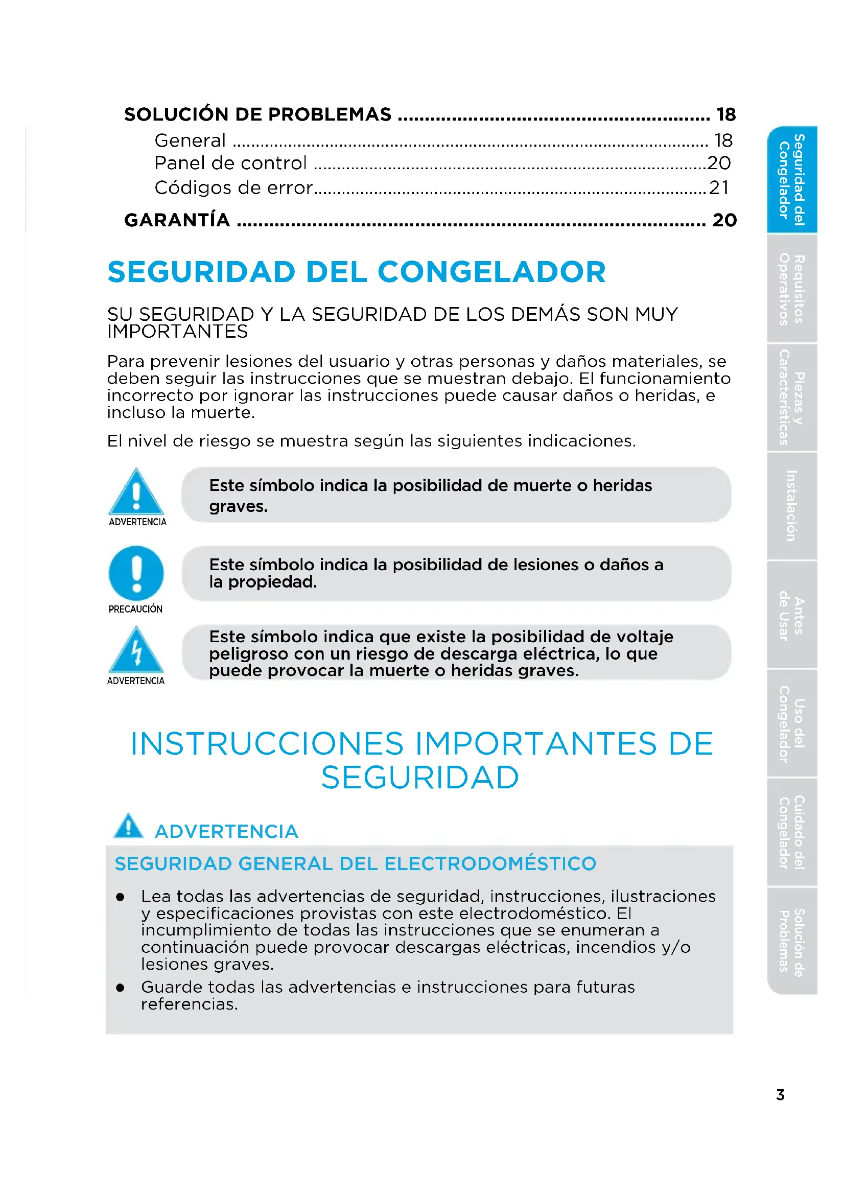 Seguridad del CongeladorRequisitos OperativosPiezas y CaracterísticasInstalaciónUso del CongeladorCuidado del CongeladorSolución de ProblemasAntes de Usar