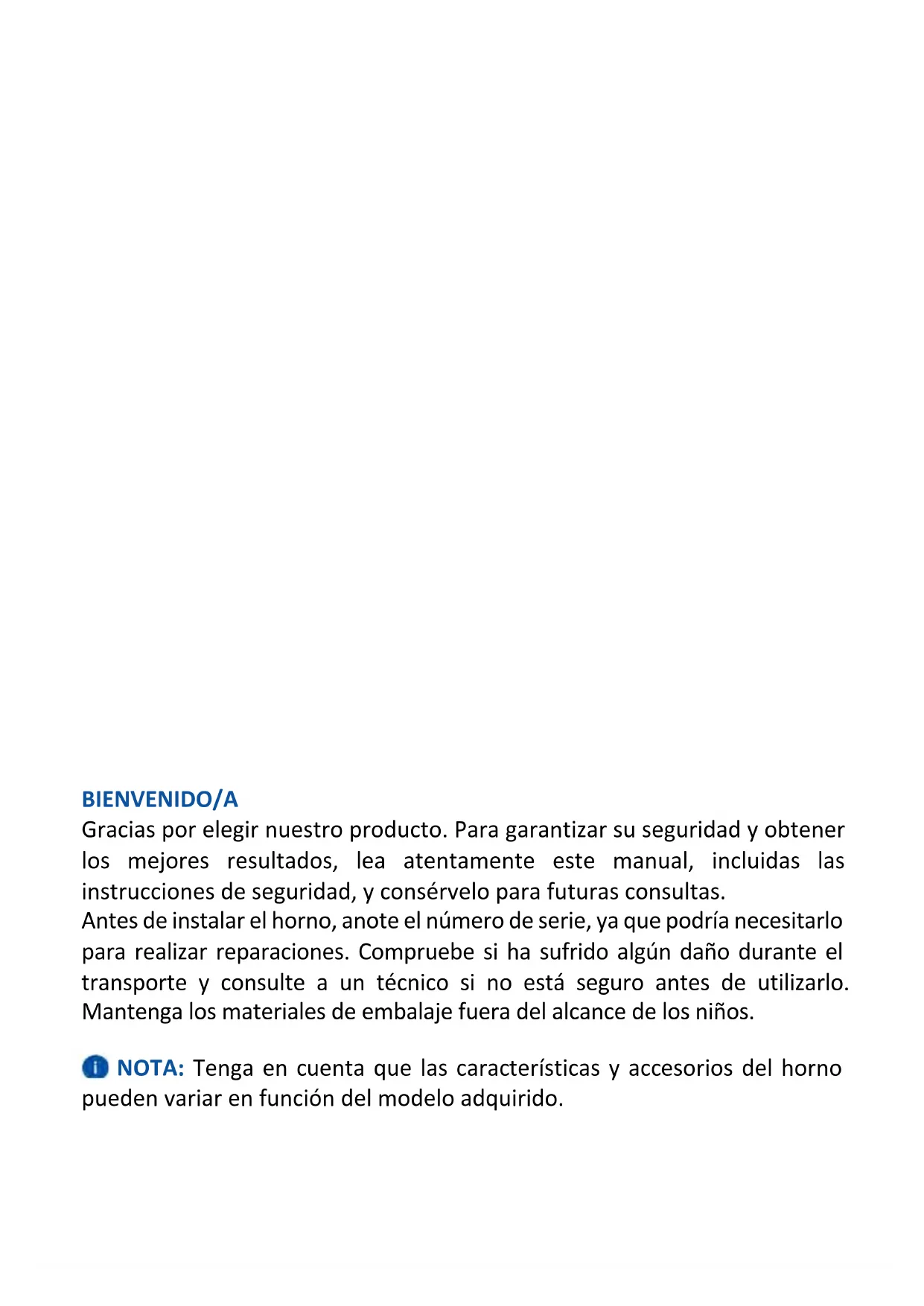 ODER Stoßfänger Stoßfänger mmBIENVENIDO/A Gracias por elegir nuestro producto. Para garantizar su seguridad y obtener los mejores resultados, lea atentamente este manual, incluidas las instrucciones de seguridad, y consérvelo para futuras consultas. Antes de instalar el horno, anote el número de serie, ya que podría necesitarlo para realizar reparaciones. Compruebe si ha sufrido algún daño durante el transporte y consulte a un técnico si no está seguro antes de utilizarlo. Mantenga los materiales de embalaje fuera del alcance de los niños. NOTA: Tenga en cuenta que las características y accesorios del horno pueden variar en función del modelo adquirido.ÍNDICE
