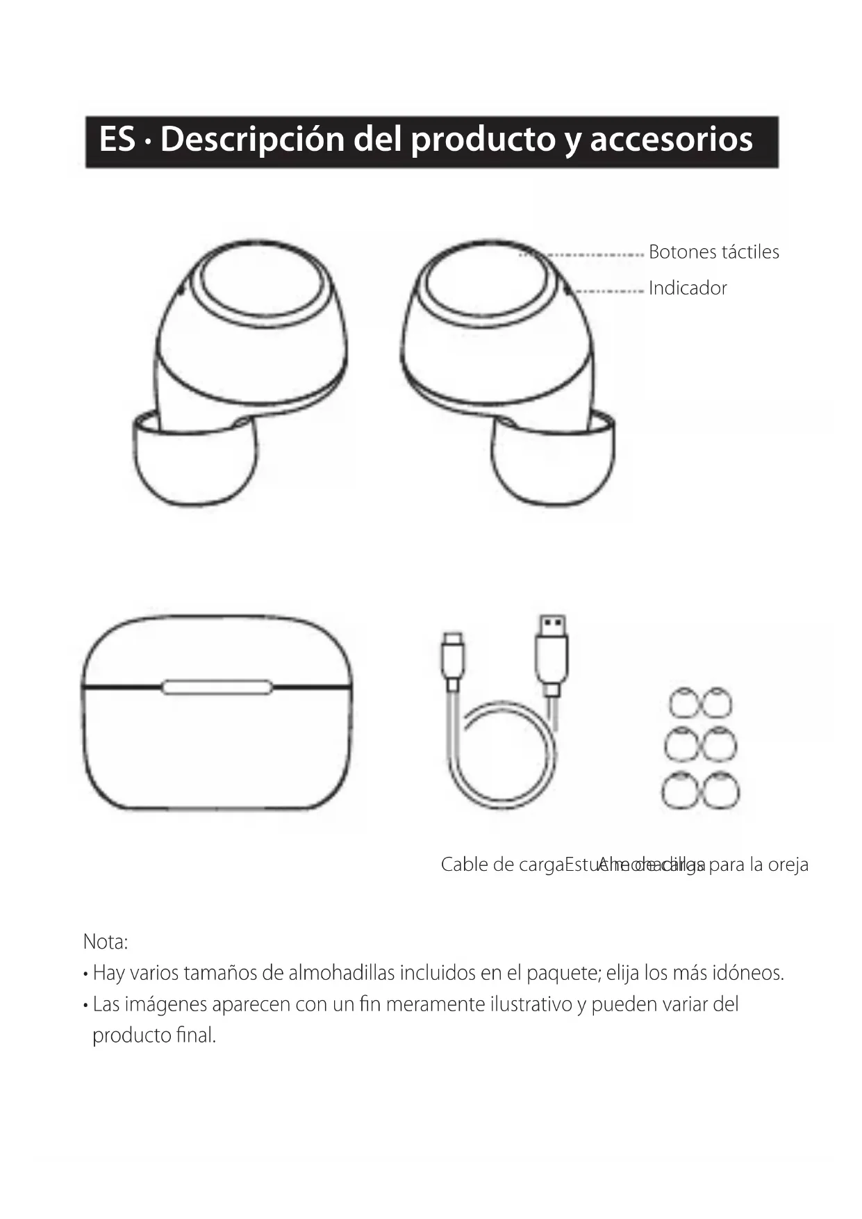 - Las imágenes aparecen con un fin meramente ilustrativo y pueden variar del producto final. Cable de cargaEstuche de carga Almohadillas para la oreja Indicador Botones táctiles● Cargue los auriculares Advertencia: Las baterías recargables que alimentan este producto deben desecharse adecuadamente para su reciclaje. No deseche las baterías en el fuego para evitar una explosión. ■ Guía de usuario