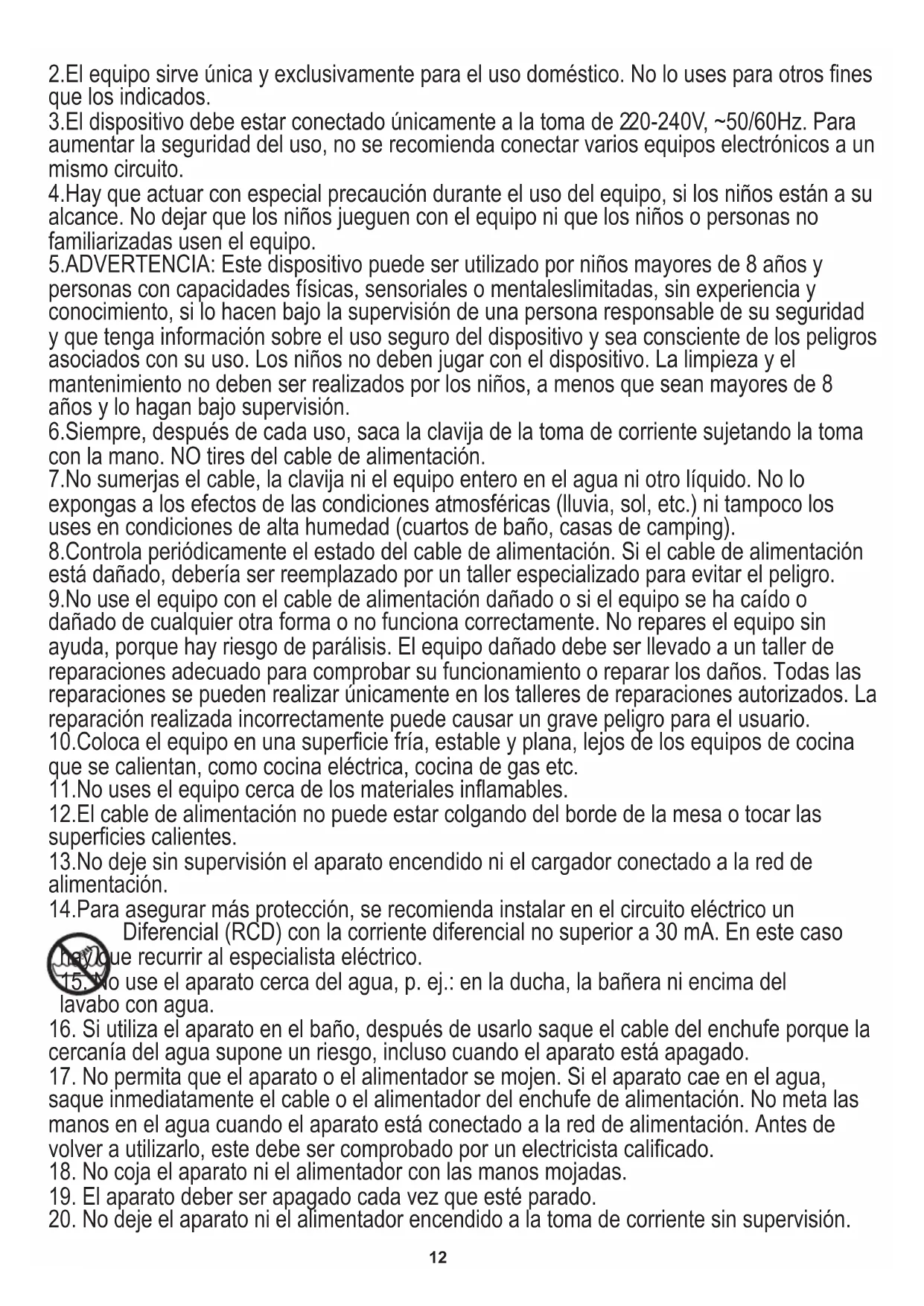 INSTRUCCIONES IMPORTANTES DE SEGURIDAD PARA EL USUARIO POR FAVOR LEA ATENTAMENTE Y GUÁRDELAS PARA CONSULTAR EN EL FUTURO Si usa el aparato con fines comerciales, las condiciones de la garantía cambiarán.12 2.El equipo sirve única y exclusivamente para el uso doméstico. No lo uses para otros fines que los indicados. 3.El dispositivo debe estar conectado únicamente a la toma de 220-240V, ~50/60Hz. Para aumentar la seguridad del uso, no se recomienda conectar varios equipos electrónicos a un mismo circuito. 4.Hay que actuar con especial precaución durante el uso del equipo, si los niños están a su alcance. No dejar que los niños jueguen con el equipo ni que los niños o personas no familiarizadas usen el equipo. 5.ADVERTENCIA: Este dispositivo puede ser utilizado por niños mayores de 8 años y personas con capacidades físicas, sensoriales o mentaleslimitadas, sin experiencia y conocimiento, si lo hacen bajo la supervisión de una persona responsable de su seguridad y que tenga información sobre el uso seguro del dispositivo y sea consciente de los peligros asociados con su uso. Los niños no deben jugar con el dispositivo. La limpieza y el mantenimiento no deben ser realizados por los niños, a menos que sean mayores de 8 años y lo hagan bajo supervisión.