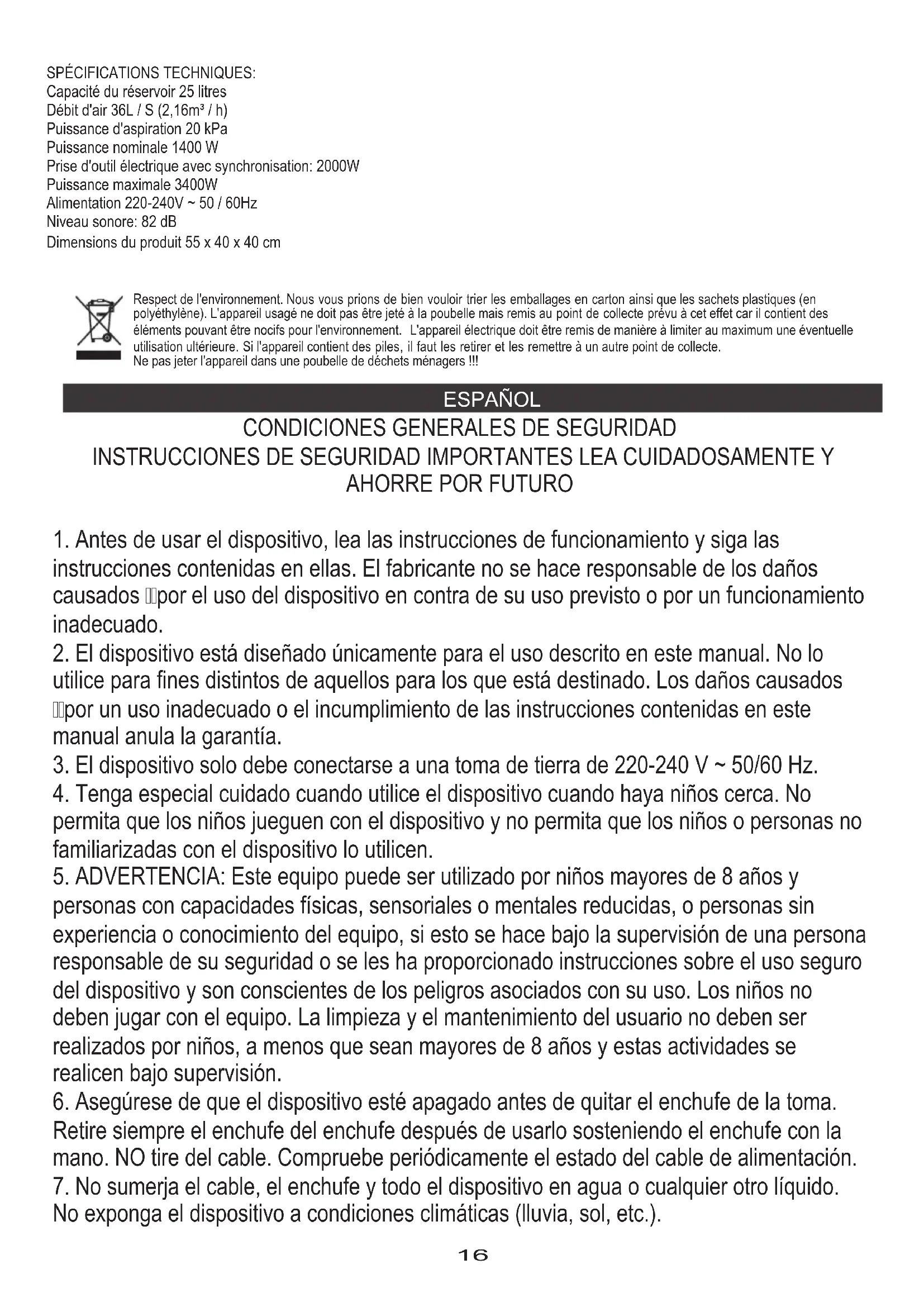 No exponga el dispositivo a condiciones climáticas (lluvia, sol, etc.). SPÉCIFICATIONS TECHNIQUES: Capacité du réservoir 25 litres Débit d'air 36L / S (2,16m³ / h) Puissance d'aspiration 20 kPa Puissance nominale 1400 W Prise d'outil électrique avec synchronisation: 2000W Puissance maximale 3400W Alimentation 220-240V ~ 50 / 60Hz Niveau sonore: 82 dB Dimensions du produit 55 x 40 x 40 cm17