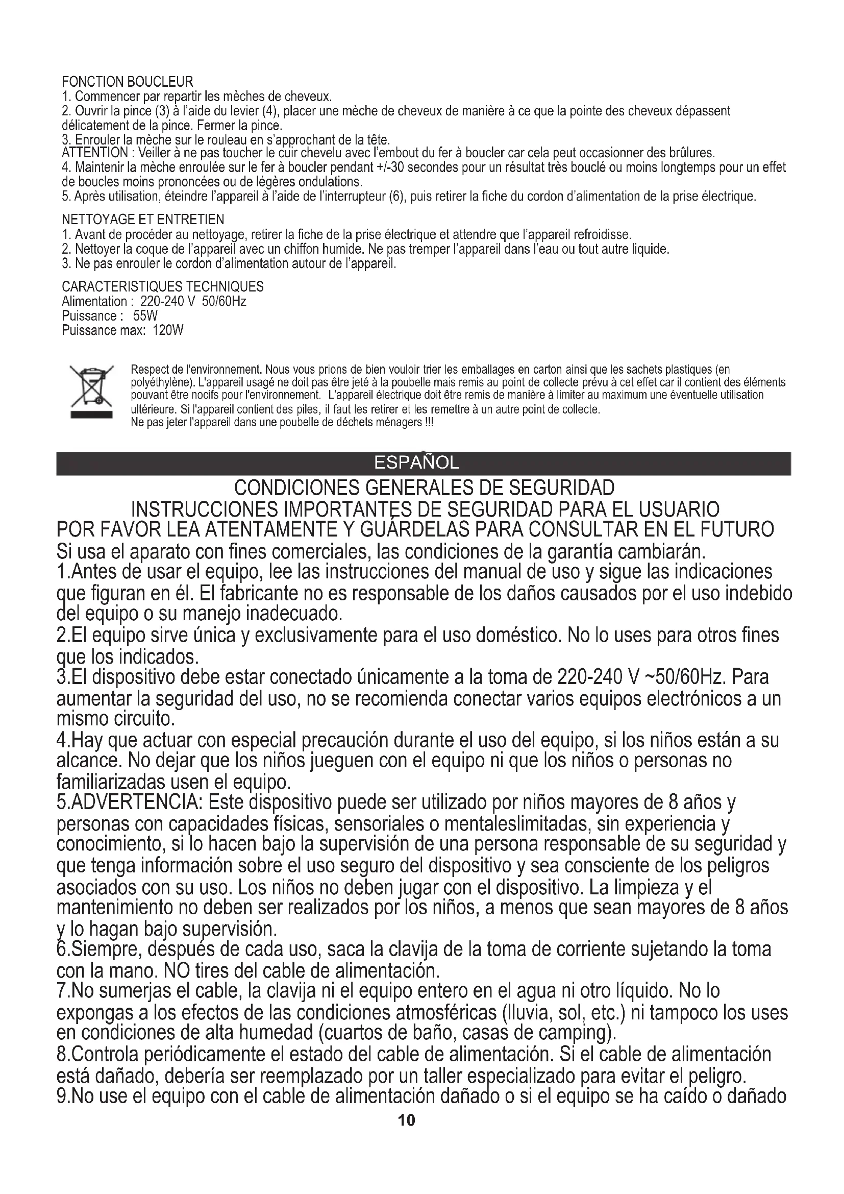 ATENCIÓN: Tenga cuidado de no tocar el cuero cabelludo ya que esto puede causar una quemadura. 4. Mantenga el mechón enrollado en el rizador durante +/-30 segundos para un efecto fuerte y menos tiempo para obtener unos rizos delicados o el pelo ondulado. 5. Después del trabajo, apague la plancha alisadora de pelo pulsando el botón de apagado (6), a continuación, desenchufe el cable de la toma de corriente.