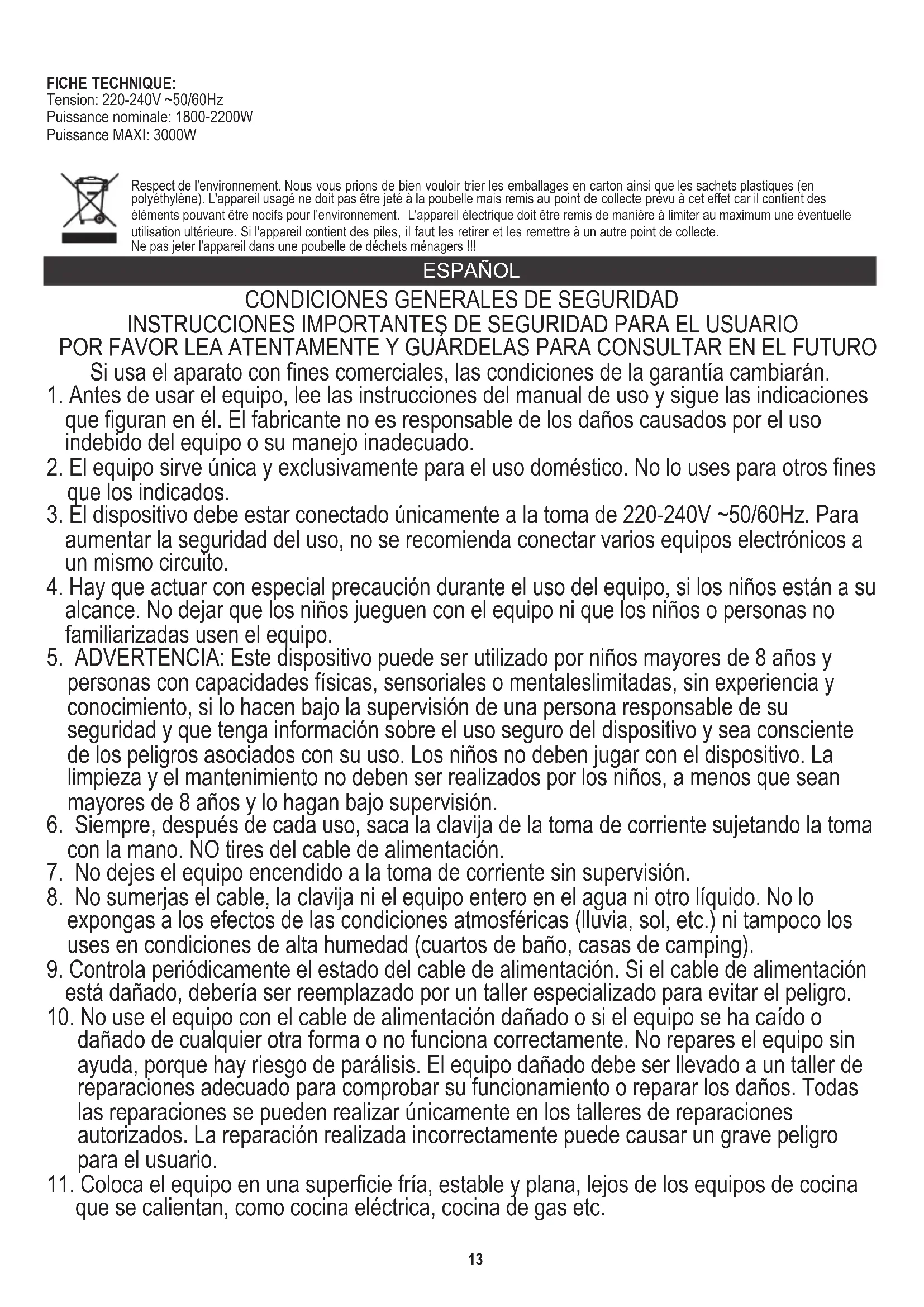 1. Se recomienda el uso de bajas temperaturas en el planchado de tejidos que tienen terminaciones especiales, adornos (lentejuelas, bordados, etc.). FICHA TÉCNICA: Potencia nominal: 1800-2200W 3. Si no conoce el tejido, determine la temperatura realizando una prueba en un trozo de ropa invisible a la hora de llevarla. Empiece por la temperatura más baja y súbala poco a poco, hasta conseguir la temperatura adecuada y segura para el tejido. 2. Si el tejido está compuesto de varios tipos de tela (por ejemplo, 40% algodón, 60% tejidos sintéticos), ajuste el termostato a la temperatura más baja (en este caso será la temperatura para tejidos sintéticos, es decir, baja temperatura). 6. Para evitar el efecto de “brillo” de los tejidos como seda, lana o tejidos sintéticos, se recomienda el planchado por el reverso. RECOMENDACIONES