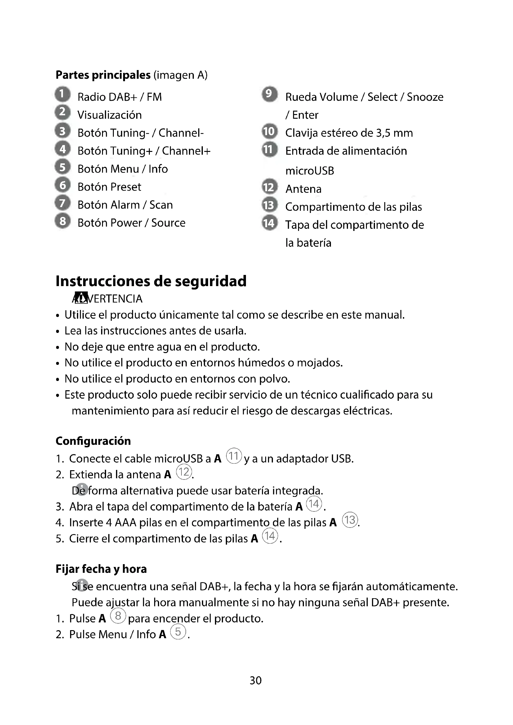 Guía de inicio rápido Radio DAB+ / FM RDDB1000BK Para más información, consulte el manual ampliado en línea: ned.is/rddb1000bk Uso previsto por el fabricante El producto está diseñado exclusivamente para ser usado como una radio con reloj despertador. Cualquier modicación del producto puede tener consecuencias para la seguridad, la garantía y el funcionamiento adecuado.30 Partes principales (imagen A)