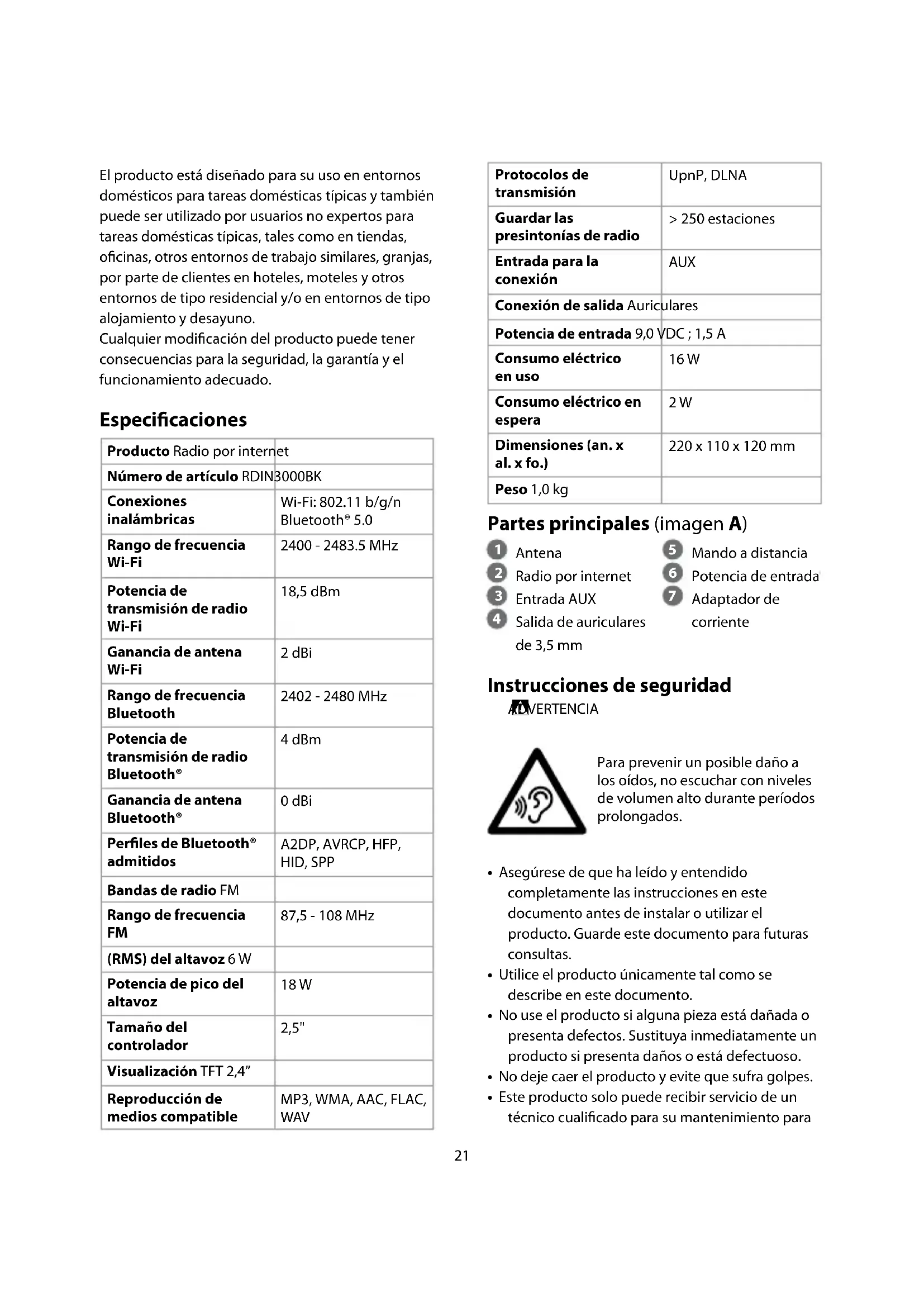 - Este producto solo puede recibir servicio de un técnico cualificado para su mantenimiento para El producto está diseñado para su uso en entornos domésticos para tareas domésticas típicas y también puede ser utilizado por usuarios no expertos para tareas domésticas típicas, tales como en tiendas, oficinas, otros entornos de trabajo similares, granjas, por parte de clientes en hoteles, moteles y otros entornos de tipo residencial y/o en entornos de tipo alojamiento y desayuno. Cualquier modificación del producto puede tener consecuencias para la seguridad, la garantía y el funcionamiento adecuado. Especicaciones Producto Radio por internet Número de artículo RDIN3000BK Conexiones inalámbricas Wi-Fi: 802.11 b/g/n Bluetooth® 5.0 Rango de frecuencia Wi-Fi 2400 - 2483.5 MHz Potencia de transmisión de radio Wi-Fi 18,5 dBm Ganancia de antena Wi-Fi 2 dBi Rango de frecuencia Bluetooth 2402 - 2480 MHz Potencia de transmisión de radio Bluetooth® 4 dBm Ganancia de antena Bluetooth® 0 dBi Perles de Bluetooth® admitidos A2DP, AVRCP, HFP, HID, SPP Bandas de radio FM Rango de frecuencia