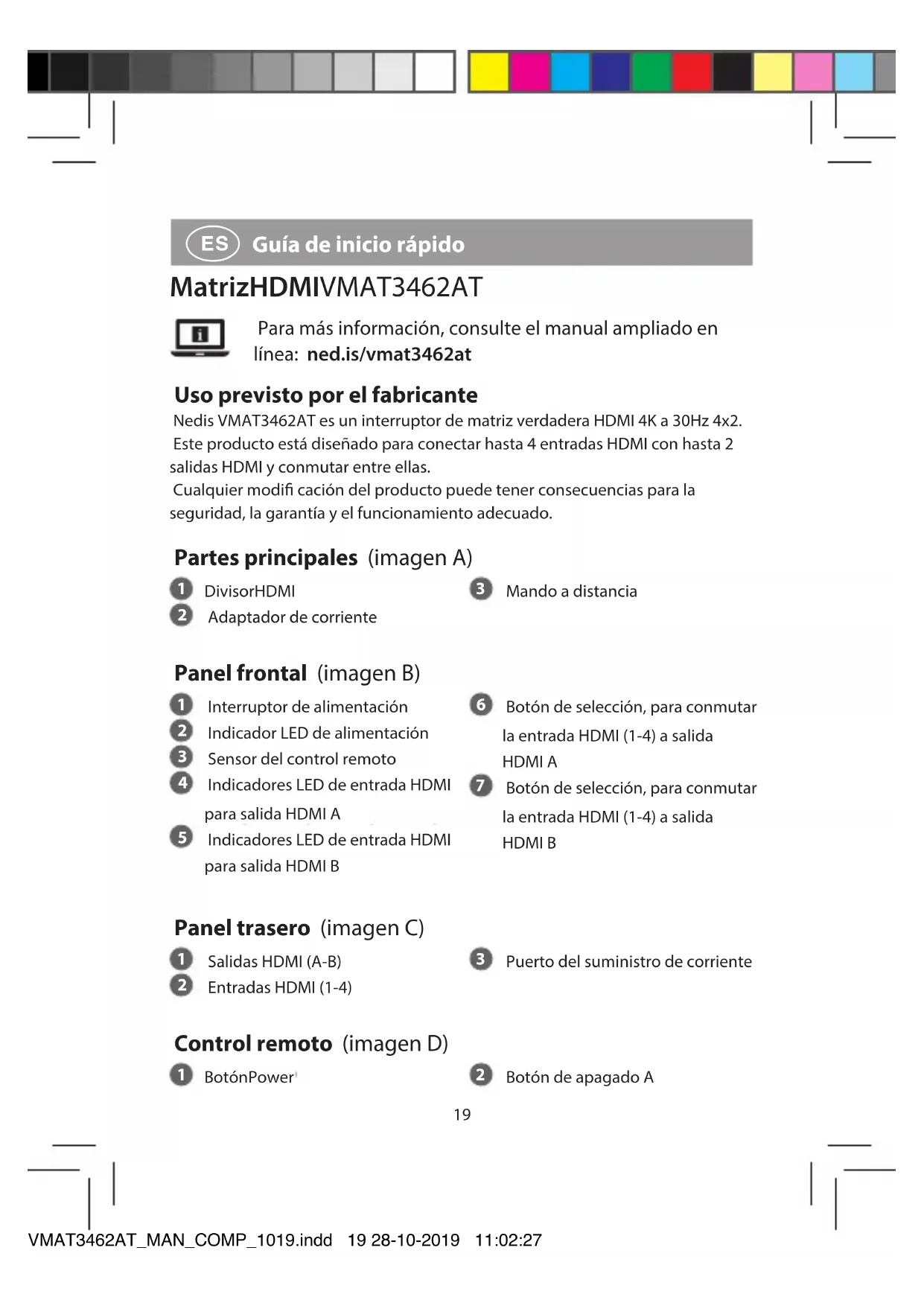 Para más información, consulte el manual ampliado en línea: ned.is/vmat3462at Uso previsto por el fabricante Nedis VMAT3462AT es un interruptor de matriz verdadera HDMI 4K a 30Hz 4x2. Este producto está diseñado para conectar hasta 4 entradas HDMI con hasta 2 salidas HDMI y conmutar entre ellas. Cualquier modi cación del producto puede tener consecuencias para la seguridad, la garantía y el funcionamiento adecuado. Partes principales (imagen A)