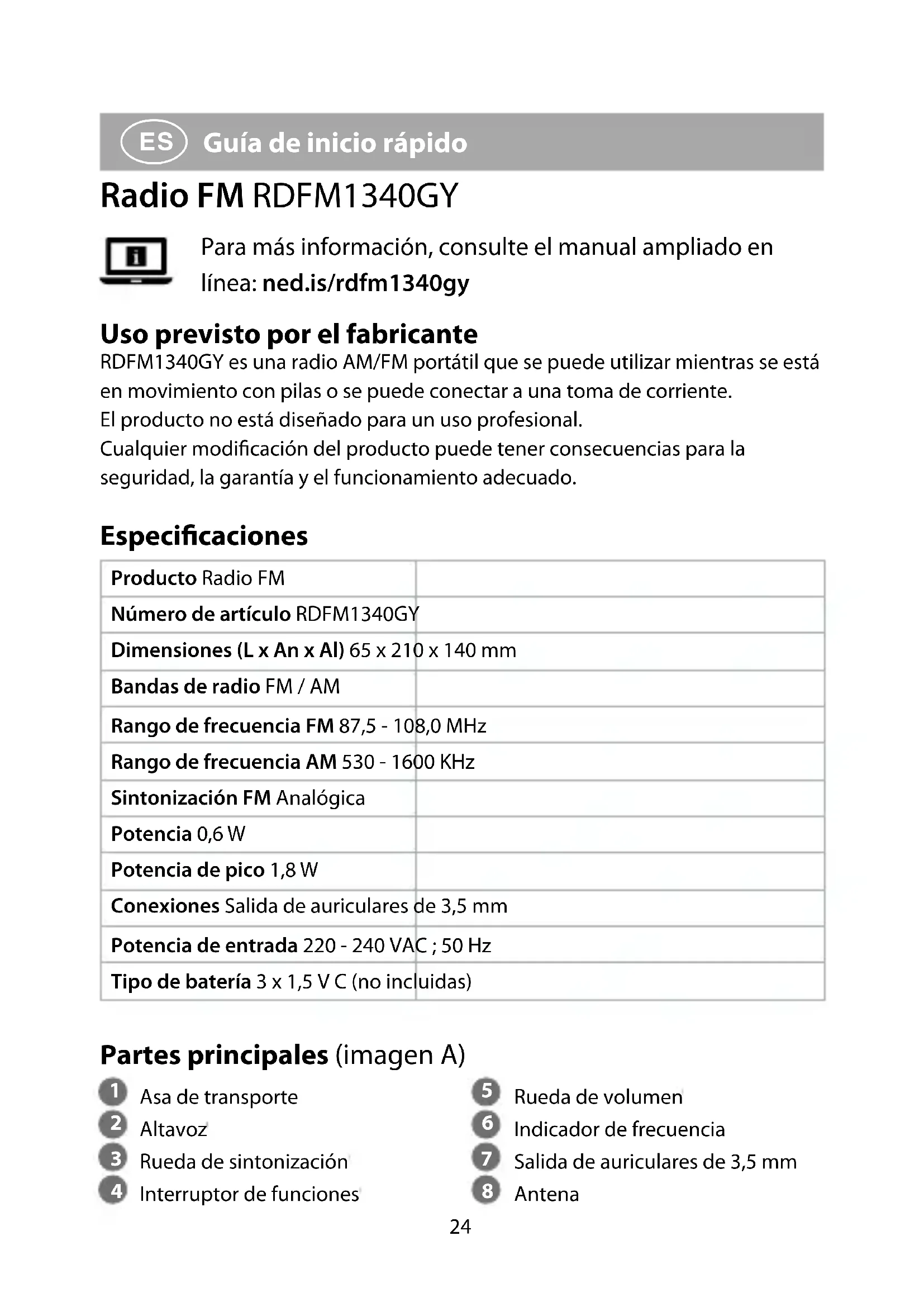 Guía de inicio rápido Radio FM RDFM1340GY Para más información, consulte el manual ampliado en línea: ned.is/rdfm1340gy Uso previsto por el fabricante RDFM1340GY es una radio AM/FM portátil que se puede utilizar mientras se está en movimiento con pilas o se puede conectar a una toma de corriente. El producto no está diseñado para un uso profesional. Cualquier modicación del producto puede tener consecuencias para la seguridad, la garantía y el funcionamiento adecuado. Especicaciones Producto Radio FM Número de artículo RDFM1340GY Dimensiones (L x An x Al) 65 x 210 x 140 mm Bandas de radio FM / AM Rango de frecuencia FM 87,5 - 108,0 MHz Rango de frecuencia AM 530 - 1600 KHz Sintonización FM Analógica Potencia 0,6 W Potencia de pico 1,8 W Conexiones Salida de auriculares de 3,5 mm Potencia de entrada 220 - 240 VAC ; 50 Hz Tipo de batería 3 x 1,5 V C (no incluidas) Partes principales (imagen A)