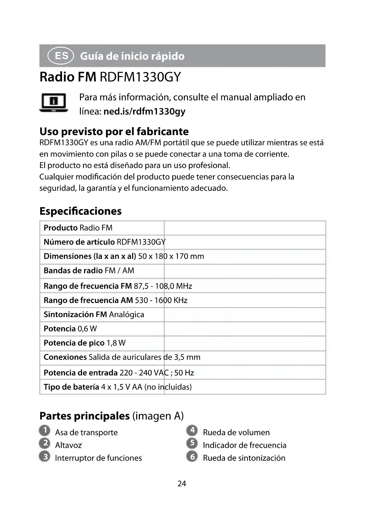 Guía de inicio rápido Radio FM RDFM1330GY Para más información, consulte el manual ampliado en línea: ned.is/rdfm1330gy Uso previsto por el fabricante RDFM1330GY es una radio AM/FM portátil que se puede utilizar mientras se está en movimiento con pilas o se puede conectar a una toma de corriente. El producto no está diseñado para un uso profesional. Cualquier modicación del producto puede tener consecuencias para la seguridad, la garantía y el funcionamiento adecuado. Especicaciones Producto Radio FM Número de artículo RDFM1330GY Dimensiones (la x an x al) 50 x 180 x 170 mm Bandas de radio FM / AM Rango de frecuencia FM 87,5 - 108,0 MHz Rango de frecuencia AM 530 - 1600 KHz Sintonización FM Analógica Potencia 0,6 W Potencia de pico 1,8 W Conexiones Salida de auriculares de 3,5 mm Potencia de entrada 220 - 240 VAC ; 50 Hz Tipo de batería 4 x 1,5 V AA (no incluidas) Partes principales (imagen A)
