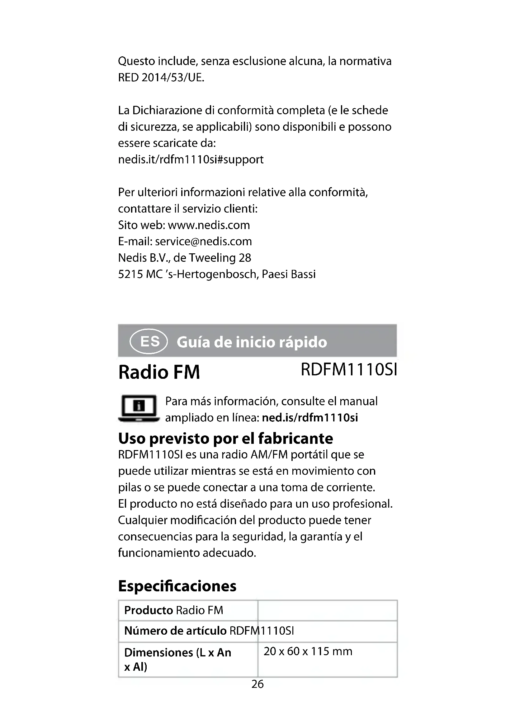 producido en China, ha sido probado de acuerdo con todas las normas y regulaciones relevantes de la CE y que se han superado todas las pruebas con éxito. Esto incluye, entre otras, la directiva europea sobre equipos radioeléctricos RED 2014/53/UE.La declaración de conformidad completa (y la hoja de datos de seguridad, si procede) se puede encontrar y descargar en:nedis.es/rdfm1110si#supportPara más información sobre el cumplimiento, póngase en contacto con el servicio de atención al cliente:Página web: www.nedis.comCorreo electrónico: service@nedis.comNedis B.V., de Tweeling 285215 MC ’s-Hertogenbosch (Países Bajos)