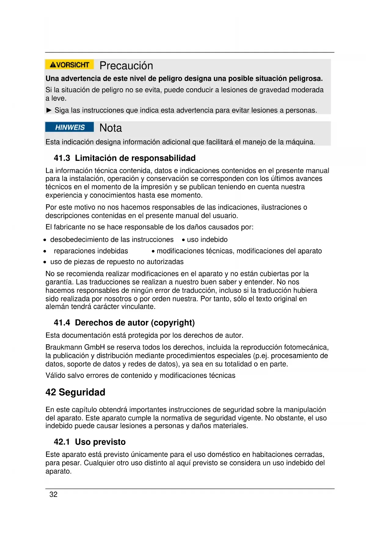 Esta documentación está protegida por los derechos de autor. Braukmann GmbH se reserva todos los derechos, incluida la reproducción fotomecánica, la publicación y distribución mediante procedimientos especiales (p.ej. procesamiento de datos, soporte de datos y redes de datos), ya sea en su totalidad o en parte. Válido salvo errores de contenido y modificaciones técnicas 42 Seguridad En este capítulo obtendrá importantes instrucciones de seguridad sobre la manipulación del aparato. Este aparato cumple la normativa de seguridad vigente. No obstante, el uso indebido puede causar lesiones a personas y daños materiales.