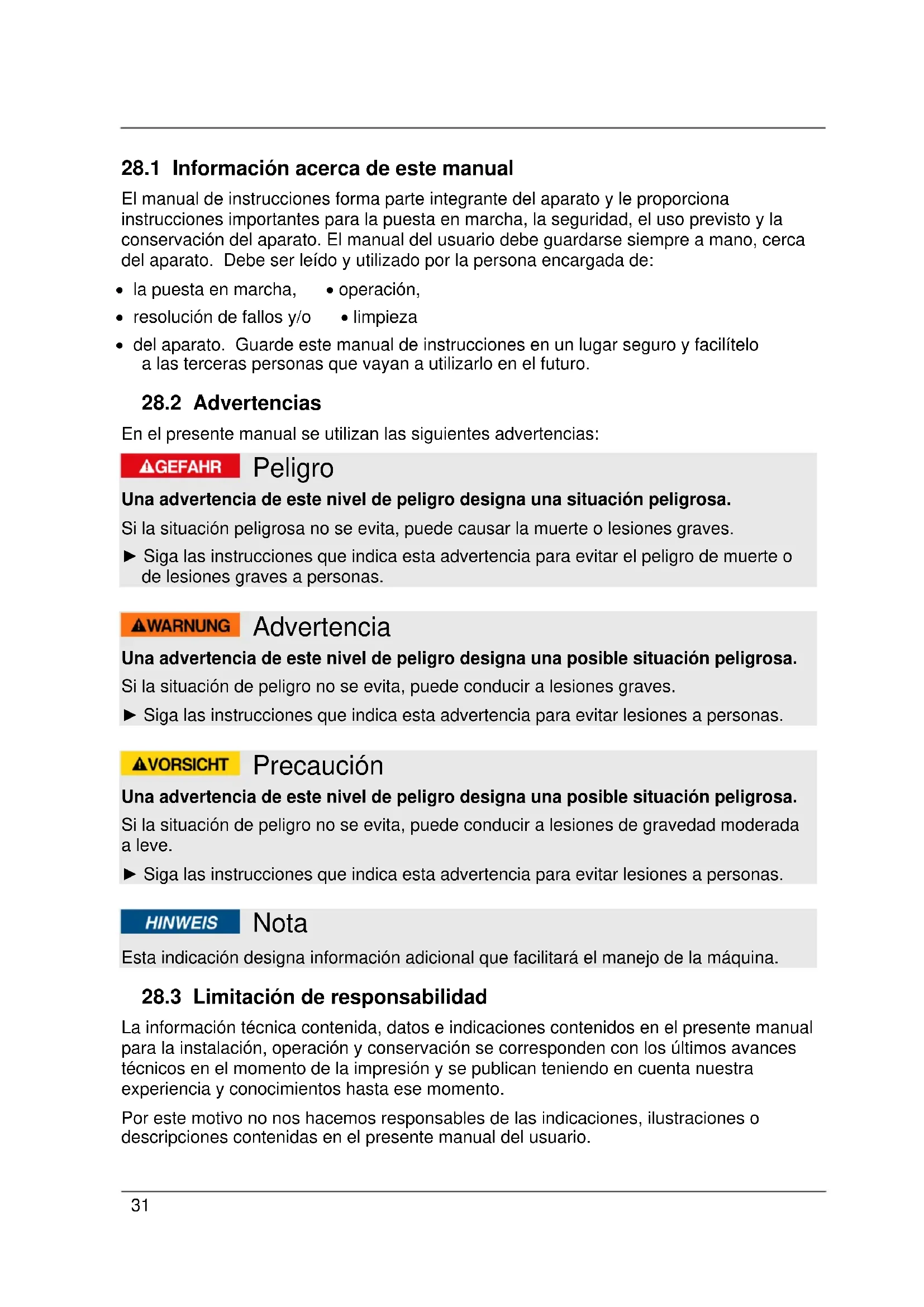 En el presente manual se utilizan las siguientes advertencias: Peligro Una advertencia de este nivel de peligro designa una situación peligrosa. Si la situación peligrosa no se evita, puede causar la muerte o lesiones graves. ► Siga las instrucciones que indica esta advertencia para evitar el peligro de muerte o de lesiones graves a personas. Advertencia Una advertencia de este nivel de peligro designa una posible situación peligrosa. Si la situación de peligro no se evita, puede conducir a lesiones graves. ► Siga las instrucciones que indica esta advertencia para evitar lesiones a personas. Precaución Una advertencia de este nivel de peligro designa una posible situación peligrosa. Si la situación de peligro no se evita, puede conducir a lesiones de gravedad moderada a leve. ► Siga las instrucciones que indica esta advertencia para evitar lesiones a personas. Nota Esta indicación designa información adicional que facilitará el manejo de la máquina.