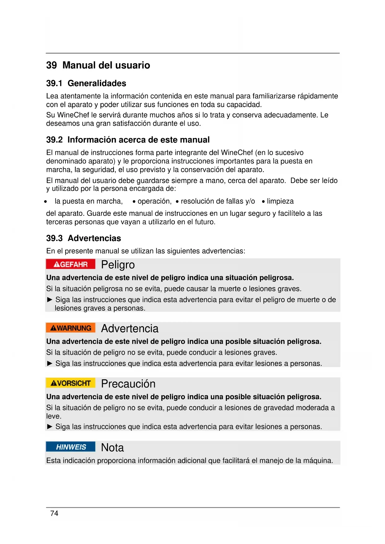 En el presente manual se utilizan las siguientes advertencias: Peligro Una advertencia de este nivel de peligro indica una situación peligrosa. Si la situación peligrosa no se evita, puede causar la muerte o lesiones graves. ► Siga las instrucciones que indica esta advertencia para evitar el peligro de muerte o de lesiones graves a personas. Advertencia Una advertencia de este nivel de peligro indica una posible situación peligrosa. Si la situación de peligro no se evita, puede conducir a lesiones graves. ► Siga las instrucciones que indica esta advertencia para evitar lesiones a personas. Precaución Una advertencia de este nivel de peligro indica una posible situación peligrosa. Si la situación de peligro no se evita, puede conducir a lesiones de gravedad moderada a leve. ► Siga las instrucciones que indica esta advertencia para evitar lesiones a personas. Nota Esta indicación proporciona información adicional que facilitará el manejo de la máquina.75