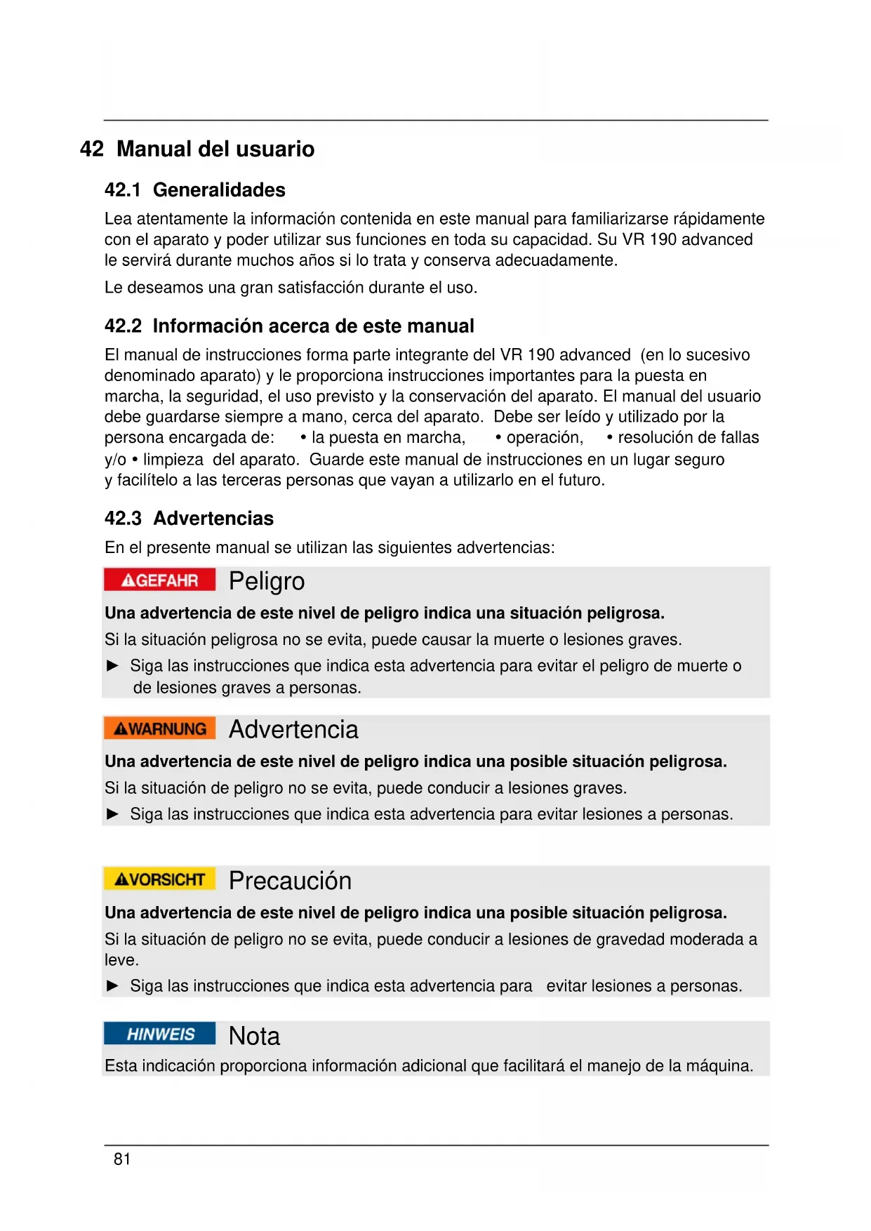 El manual de instrucciones forma parte integrante del VR 190 advanced (en lo sucesivo denominado aparato) y le proportiona instrucciones importantes para la puesta en marcha, la seguridad, el uso previsto y la conservacion del aparato. El manual del usuario debe guardarse siempre a mano, cerca del aparato. Debe ser leido y utilizar por la persona encargada de: • la puesta en marcha, • operacion, •Resolution de fallas y/o • limpieza del aparato. Guarde este manual de instrucciones en un lugar seguro y fácilarlo a las terceras personas que vayan a utiliser en el futuro.