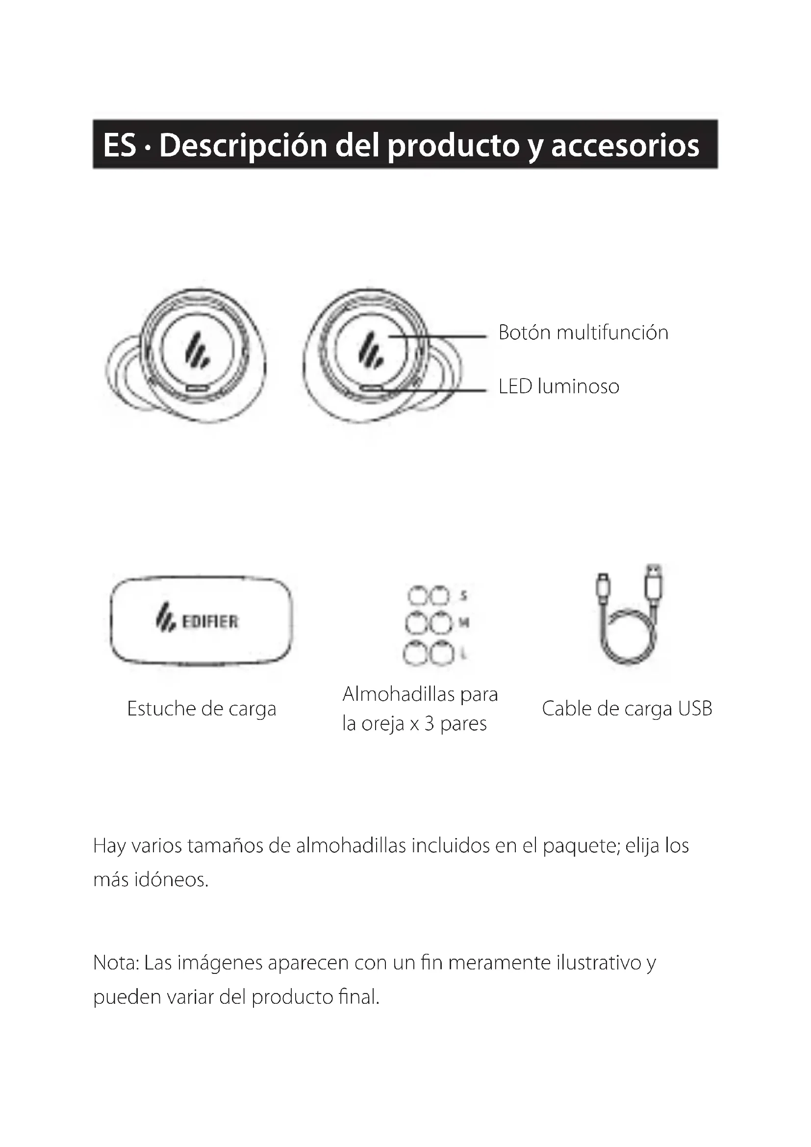- Ne pas utiliser d’objets pointus pouvant rayer la surface du produit pour éviter d’endommager le boîtier extérieur et dégrader son aspect. ■ MaintenanceEdif ier International Limited P.O. Box 6264 General Post Off ice Hong Kong www.edif ier.com 2019 Edif ier International Limited. Tous droits réservés. Imprimé en China AVIS: Pour les besoins du progrès technique et la mise à niveau du système, les informations contenues dans ce document peuvent être sujets à changements à tout moment sans préavis. Les produits d’EDIFIER seront modifiés pour certaines applications. Les photos, illustrations et spécifications montrées ici peuvent être légèrement différentes du produit réel. Si aucune différence n'est trouvée, le produit réel prévaut.Hay varios tamaños de almohadillas incluidos en el paquete; elija los más idóneos. Nota: Las imágenes aparecen con un fin meramente ilustrativo y pueden variar del producto final. Almohadillas para la oreja x 3 pares Cable de carga USB ES · Descripción del producto y accesorios Estuche de carga Botón multifunción LED luminoso■ Guía de usuario Entrada nominal: 5V 60mA(auriculares) 5V 500mA(estuche de carga) ● Cargue los auriculares Durante el uso, si solo parpadea la luz roja, indica que los auriculares tienen poca batería, utilícelos cuando se hayan cargado completamente. Carga: coloque los auriculares en el estuche de carga Testigo rojo encendido = cargando Luz roja apagada = plena carga Tiempo de carga: Aproximadamente 2 horas para una carga completa. Advertencia: Las baterías recargables que alimentan este producto deben desecharse adecuadamente para su reciclaje. No deseche las baterías en el fuego para evitar una explosión. ● Cargue la caja de carga Las luces verdes de la funda de carga indican la capacidad del nivel de la batería: Cuando se iluminen todas las luces verdes, la funda de carga puede cargar auriculares tres veces; Cuando solamente se ilumine la luz más a la izquierda, indica que la funda de carga tiene un nivel de batería bajo, cárguela a tiempo; todas las luces verdes se iluminarán cuando esté totalmente cargada.● Encendido/Apagado