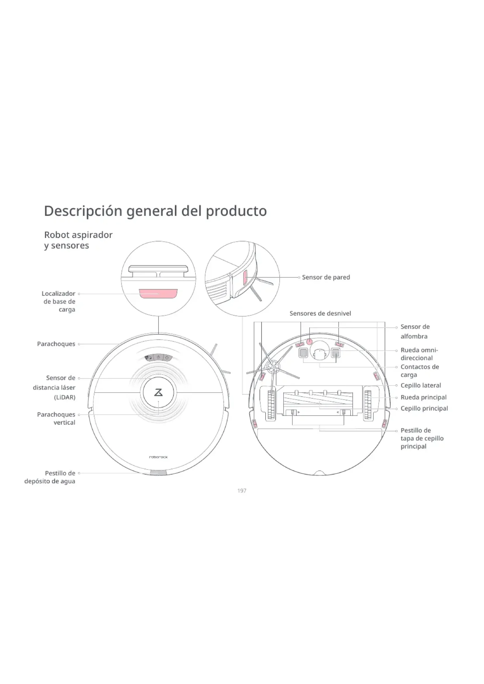 EDVHVHYHQGHSRUVHSDUDGR 9LVLWHZZZURERURFNFRPSDUD REWHQHUP£VLQIRUPDFLµQ Robot Restablecer sistema Ranuras de ventilación Soporte de paño de fregado VibraRise Depósito de agua ,QGLFDGRUGHZLࢉ Depósito de polvo 7DSDGHࢉOWUR Pestillo de depósito de polvo Filtro lavable Pestillo de tapa GHࢉOWUR Descripción general del producto Entrada de aire Nota: Robot aspirador y sensores Localizador de base de carga Parachoques Sensor de distancia láser (LiDAR) Parachoques vertical Pestillo de depósito de agua Sensores de desnivel Rueda omni- direccional Sensor de pared Contactos de carga Sensor de alfombra Cepillo lateral Rueda principal Cepillo principal Pestillo de tapa de cepillo principal Descripción general del producto Módulo VibraRise Tapón de depósito de agua Filtro de agua Depósito de agua eléctrico Pestillo de depósito de agua 5DQXUDGHࢉMDFLµQGHSD³R de fregado Soporte de paño de fregado VibraRise Paño de fregado VibraRise =RQDGHࢉMDFLµQ Pestillo de soporte de paño de fregado Módulo de vibración Descripción general del producto Base de carga Baliza de localización de la base de carga Indicador de encendido de la base de carga Contactos de carga Cepillos de electrodos Descripción general del producto Toma de alimentación Importante $QWHVGHOLPSLDUUHFRMDORVFDEOHV\REMHWRVGLVSHUVRVSRUHO