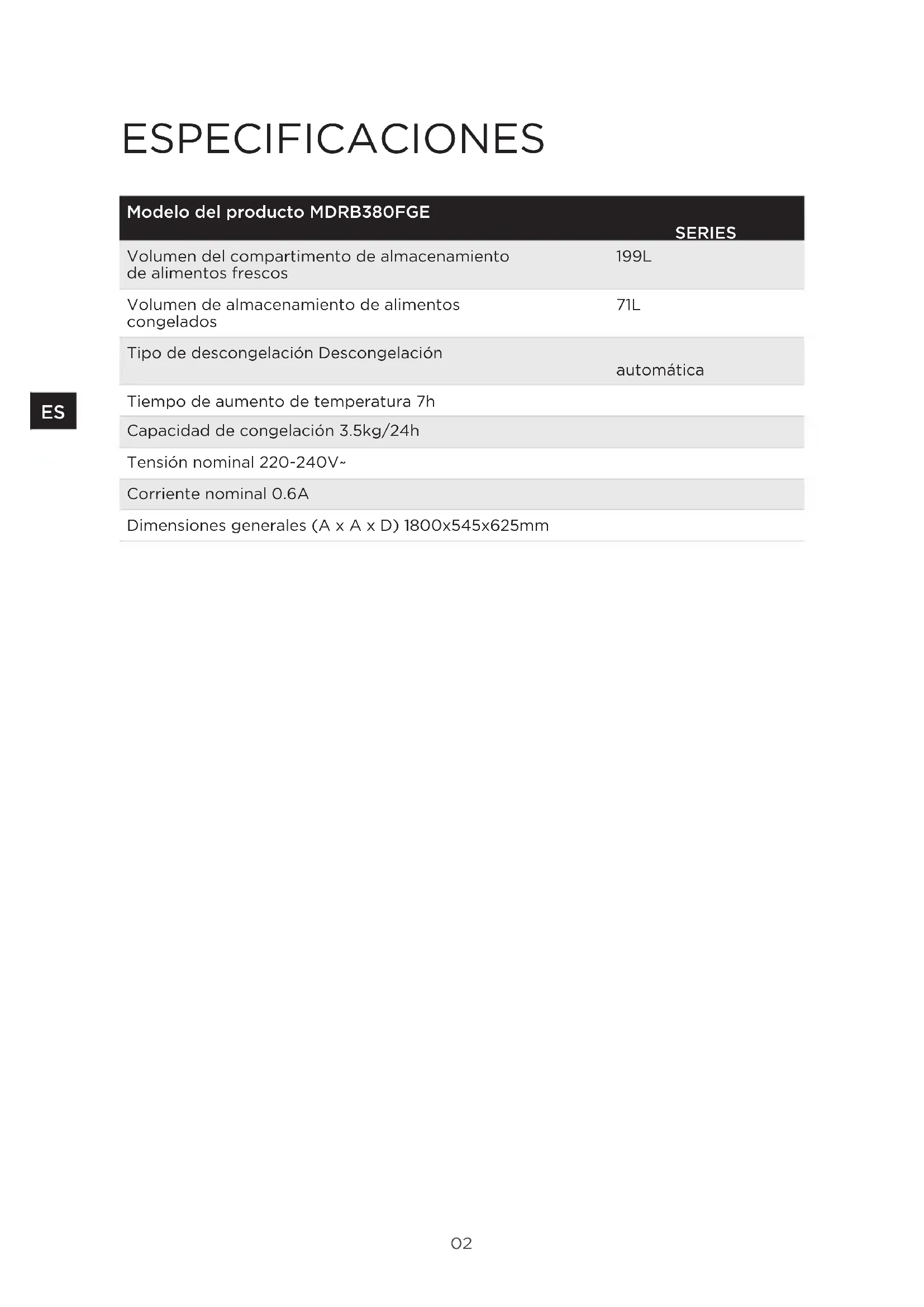 ES02 ESPECIFICACIONES Modelo del producto MDRB380FGE SERIES Volumen del compartimento de almacenamiento de alimentos frescos 199L Volumen de almacenamiento de alimentos congelados 71L Tipo de descongelación Descongelación automática Tiempo de aumento de temperatura 7h Capacidad de congelación 3.5kg/24h Tensión nominal 220-240V~ Corriente nominal 0.6A Dimensiones generales (A x A x D) 1800x545x625mm ES03