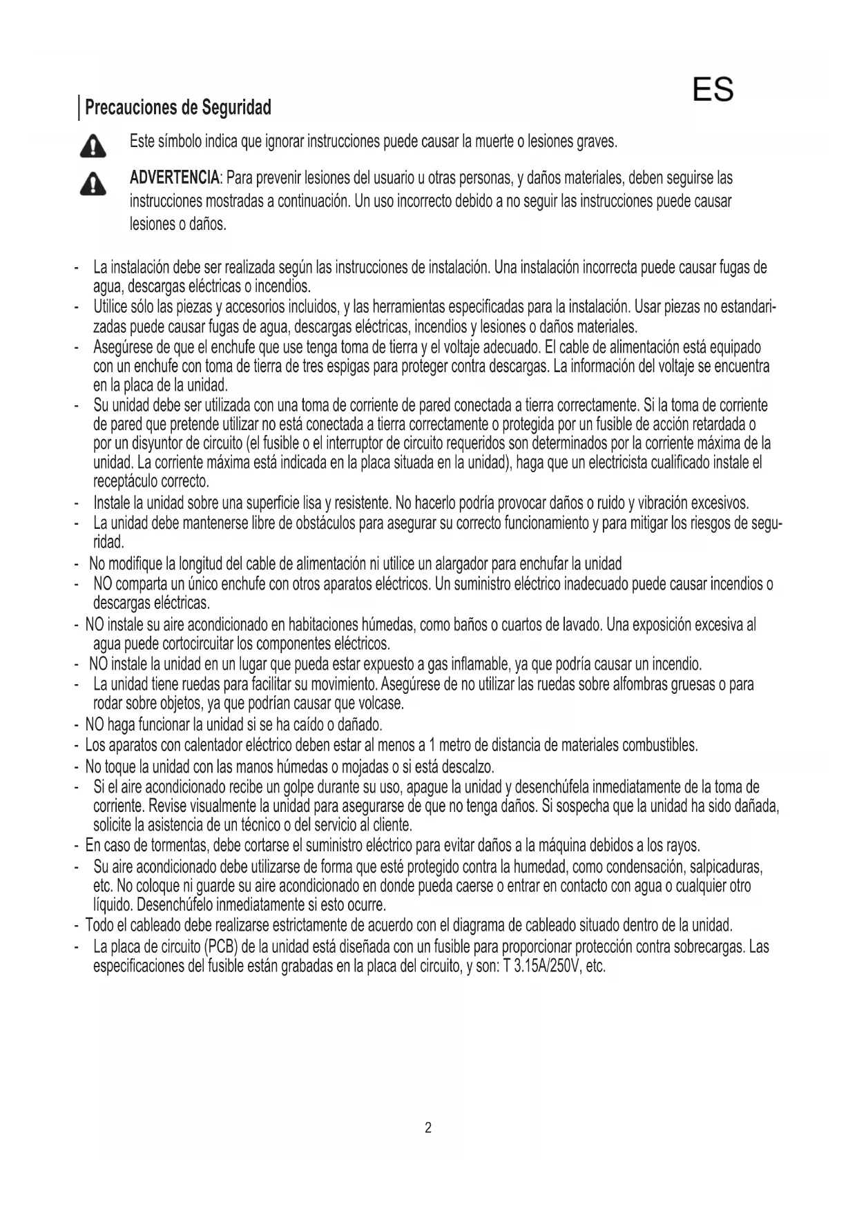 - Observación Social ES2 │Precauciones de Seguridad Este símbolo indica que ignorar instrucciones puede causar la muerte o lesiones graves. ADVERTENCIA: Para prevenir lesiones del usuario u otras personas, y daños materiales, deben seguirse las instrucciones mostradas a continuación. Un uso incorrecto debido a no seguir las instrucciones puede causar lesiones o daños. - La instalación debe ser realizada según las instrucciones de instalación. Una instalación incorrecta puede causar fugas de agua, descargas eléctricas o incendios. - Utilicesólolaspiezasyaccesoriosincluidos,ylasherramientasespecicadasparalainstalación.Usarpiezasnoestandari- zadas puede causar fugas de agua, descargas eléctricas, incendios y lesiones o daños materiales. - Asegúrese de que el enchufe que use tenga toma de tierra y el voltaje adecuado. El cable de alimentación está equipado con un enchufe con toma de tierra de tres espigas para proteger contra descargas. La información del voltaje se encuentra en la placa de la unidad. - Su unidad debe ser utilizada con una toma de corriente de pared conectada a tierra correctamente. Si la toma de corriente de pared que pretende utilizar no está conectada a tierra correctamente o protegida por un fusible de acción retardada o por un disyuntor de circuito (el fusible o el interruptor de circuito requeridos son determinados por la corriente máxima de la unidad.Lacorrientemáximaestáindicadaenlaplacasituadaenlaunidad),hagaqueunelectricistacualicadoinstaleel receptáculo correcto. - Instalelaunidadsobreunasupercielisayresistente.Nohacerlopodríaprovocardañosoruidoyvibraciónexcesivos. - La unidad debe mantenerse libre de obstáculos para asegurar su correcto funcionamiento y para mitigar los riesgos de segu- ridad. - Nomodiquelalongituddelcabledealimentaciónniutiliceunalargadorparaenchufarlaunidad - NO comparta un único enchufe con otros aparatos eléctricos. Un suministro eléctrico inadecuado puede causar incendios o descargas eléctricas. - NO instale su aire acondicionado en habitaciones húmedas, como baños o cuartos de lavado. Una exposición excesiva al agua puede cortocircuitar los componentes eléctricos. - NOinstalelaunidadenunlugarquepuedaestarexpuestoagasinamable,yaquepodríacausarunincendio. - La unidad tiene ruedas para facilitar su movimiento. Asegúrese de no utilizar las ruedas sobre alfombras gruesas o para rodar sobre objetos, ya que podrían causar que volcase. - NO haga funcionar la unidad si se ha caído o dañado. - Los aparatos con calentador eléctrico deben estar al menos a 1 metro de distancia de materiales combustibles. - No toque la unidad con las manos húmedas o mojadas o si está descalzo. - Si el aire acondicionado recibe un golpe durante su uso, apague la unidad y desenchúfela inmediatamente de la toma de corriente. Revise visualmente la unidad para asegurarse de que no tenga daños. Si sospecha que la unidad ha sido dañada, solicite la asistencia de un técnico o del servicio al cliente. - En caso de tormentas, debe cortarse el suministro eléctrico para evitar daños a la máquina debidos a los rayos. - Su aire acondicionado debe utilizarse de forma que esté protegido contra la humedad, como condensación, salpicaduras, etc. No coloque ni guarde su aire acondicionado en donde pueda caerse o entrar en contacto con agua o cualquier otro líquido. Desenchúfelo inmediatamente si esto ocurre. - Todo el cableado debe realizarse estrictamente de acuerdo con el diagrama de cableado situado dentro de la unidad. - La placa de circuito (PCB) de la unidad está diseñada con un fusible para proporcionar protección contra sobrecargas. Las especicacionesdelfusibleestángrabadasenlaplacadelcircuito,yson:T3.15A/250V,etc. ES3 │Precauciones Precauciones - Este aparato puede ser utilizado por niños de 8 años o más y por personas con capacidades mentales, físicas o sensoriales reducidas o limitadas, o carentes de experiencia y conocimiento si han recibido formación o supervisión sobre el uso seguro del aparato y comprenden los peligros que implica. Los niños no deben jugar con el aparato. La limpieza y el mantenimiento no deben ser realizados por niños sin supervisión (aplicable para los países europeos). - Este aparato no está diseñado para ser usado por personas (niños incluidos) con capacidades mentales, físicas o senso- riales reducidas o limitadas, o carentes de experiencia y conocimiento, a no ser que hayan recibido formación o supervisión sobre el uso del aparato por una persona responsable de su seguridad. (aplicable para los países no europeos). - Los niños deben ser vigilados para asegurarse de que no jueguen con el aparato (aplicable para los países no europeos). Los niños alrededor de la unidad deben ser vigilados en todo momento. - Si el cable de alimentación está dañado, debe ser reemplazado por el fabricante, su servicio técnico u otra persona de cuali- caciónsimilar,paraevitarriesgos. - Antes de limpiarlo o realizar otras tareas de mantenimiento, el aparato debe ser desconectado del enchufe de alimentación. - Noretireningunacubiertajada.Nuncautiliceesteaparatosinofuncionacorrectamente,osisehacaídoodañado. - No pase el cable por debajo de alfombras. No tape el cable con alfombras, tapetes o cubiertas similares. No pase el cable por debajo de muebles o electrodomésticos. Disponga el cable lejos de zonas transitadas, donde no se pueda tropezar con él. - No haga funcionar la unidad con un cable, enchufe, fusible o interruptor de circuito dañados. Deseche la unidad o devuélvala a una instalación de servicio autorizada para su examen y/o reparación. - Para reducir el riesgo de incendios o descargas eléctricas, no utilice este ventilador con cualquier dispositivo de control de velocidad de estado sólido. - El aparato debe ser instalado de acuerdo con las leyes nacionales sobre cableado. - Contacte con el servicio técnico autorizado para la reparación o el mantenimiento de esta unidad