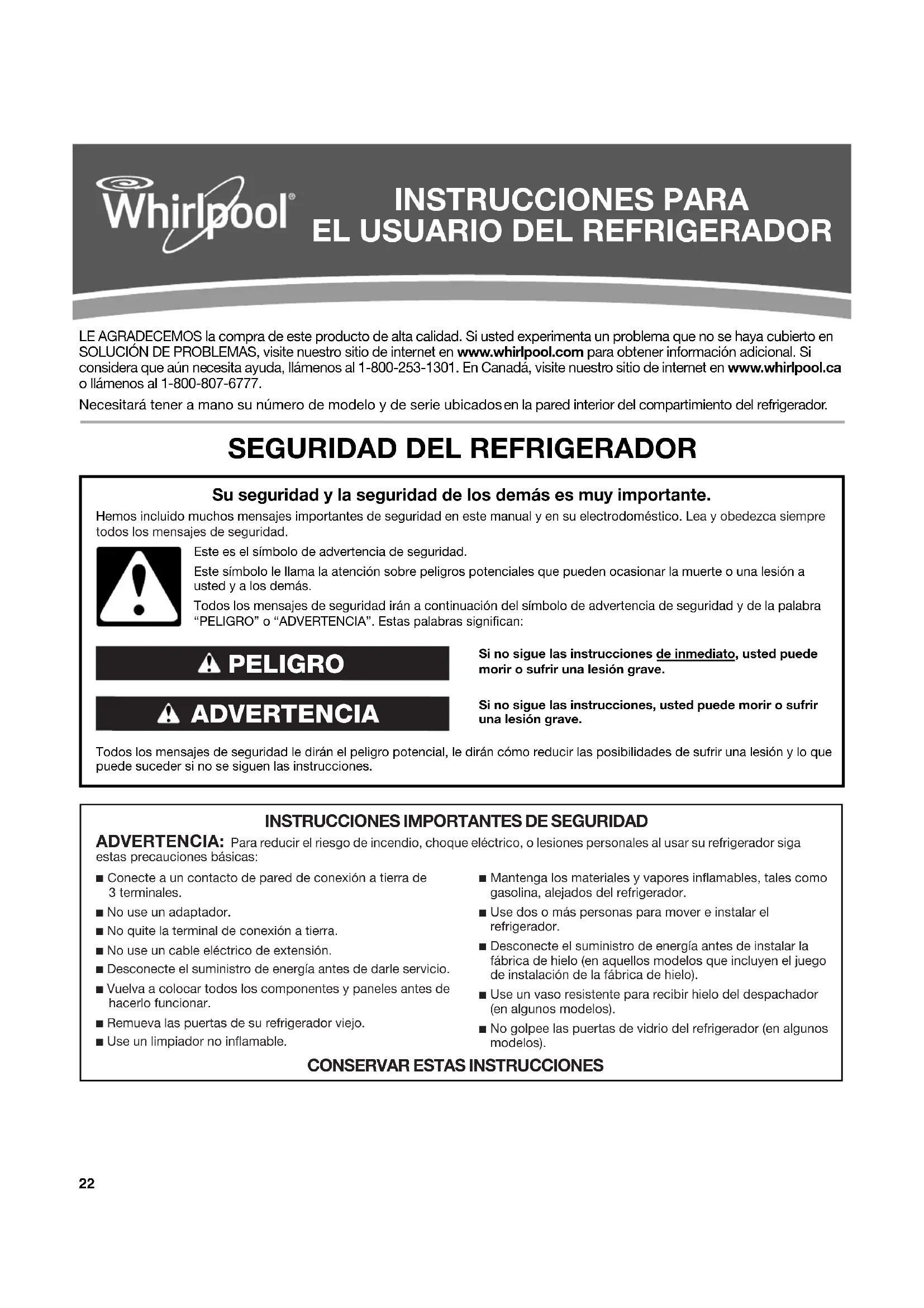 El costo de la reparación o el reemplazo bajo estas circunstancias excluidas, correrá por cuenta del cliente. EXCLUSIÓN DE GARANTÍAS IMPLÍCITAS LAS GARANTÍAS IMPLÍCITAS, INCLUYENDO CUALQUIER GARANTÍA IMPLÍCITA DE COMERCIABILIDAD O GARANTÍA IMPLÍCITA DE CAPACIDAD PARA UN PROPÓSITO PARTICULAR, SERÁN LIMITADAS A UN AÑO O AL PERÍODO MÁS CORTO PERMITIDO POR LEY. Algunos estados y provincias no permiten la limitación de la duración de garantías implícitas de comerciabilidad o aptitud, de modo que la limitación arriba indicada quizás no le corresponda. Esta garantía le otorga derechos legales específicos, y es posible que usted tenga también otros derechos que varían de un estado a otro o de una provincia a otra. LIMITACIÓN DE RECURSOS; EXCLUSIÓN DE DAÑOS INCIDENTALES O CONSECUENTES SU ÚNICO Y EXCLUSIVO RECURSO SEGÚN LOS TÉRMINOS DE ESTA GARANTÍA LIMITADA SERÁ EL DE REPARAR EL PRODUCTO SEGÚN SE ESTIPULA EN LA PRESENTE. WHIRLPOOL NO SE RESPONSABILIZARÁ POR DAÑOS INCIDENTALES O CONSECUENTES. Algunos estados y provincias no permiten la exclusión o limitación de daños incidentales o consecuentes, de modo que estas limitaciones y exclusión quizás no le correspondan. Esta garantía le otorga derechos legales específicos, y es posible que usted tenga también otros derechos que varían de un estado a otro o de una provincia a otra. Si usted se encuentra fuera de los cincuenta Estados Unidos y Canadá, póngase en contacto con su distribuidor autorizado de Whirlpool para determinar si corresponde otra garantía. 7/1244 Para obtener información adicional acerca de su producto, en EE.UU. visite www.whirlpool.com. En Canadá, visite www.whirlpool.ca. Si usted no tiene acceso a internet y necesita ayuda para usar su producto, o si quisiera hacer una cita para obtener servicio, puede ponerse en contacto con Whirlpool, en el número que se indica a continuación. Tenga listo su número de modelo completo. Puede encontrar el número de modelo y de serie en la etiqueta ubicada en la pared interior del compartimiento del refrigerador. Si necesita ayuda o servicio técnico, en EE.UU., llame al 1-800-253-1301. En Canadá, llame al 1-800-807-6777. Si necesita asistencia adicional, puede escribir a Whirlpool con sus preguntas o dudas a la dirección que aparece a continuación: En los EE.UU.: Whirlpool Brand Home Appliances Customer eXperience Center 553 Benson Road Benton Harbor, MI 49022-2692 En Canadá: Whirlpool Brand Home Appliances Customer eXperience Centre 200 – 6750 Century Ave. Mississauga, Ontario L5N 0B7 Por favor incluya en su correspondencia un número de teléfono en el que se le pueda localizar durante el día. Sírvase guardar todas las instrucciones provistas y la información con el número de modelo, para referencia futura.45 Nous vous REMERCIONS d'avoir acheté ce produit de haute qualité. Si vous rencontrez un problème non mentionné dans la section DÉPANNAGE ou RÉSOLUTION DE PROBLÈMES, veuillez visiter notre site Web www.whirlpool.com pour des informations supplémentaires. Si vous avez toujours besoin d'assistance, veuillez nous téléphoner au 1-800-253-1301. Au Canada, visitez notre site Web www.whirlpool.ca ou téléphonez-nous au 1-800-807-6777. Vous aurez besoin de vos numéros de modèle et de série situés sur la paroi interne du compartiment de réfrigération.