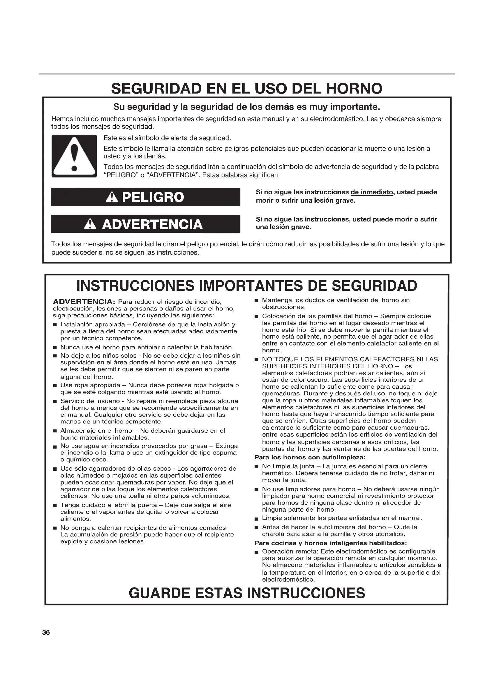ADVERTENCIA: Para reducir el riesgo de incendio, electrocución, lesiones a personas o daños al usar el horno, siga precauciones básicas, incluyendo las siguientes: Instalación apropiada – Cerciórese de que la instalación y puesta a tierra del horno sean efectuadas adecuadamente por un técnico competente. Nunca use el horno para entibiar o calentar la habitación. No deje a los niños solos - No se debe dejar a los niños sin supervisión en el área donde el horno esté en uso. Jamás se les debe permitir que se sienten ni se paren en parte alguna del horno. Use ropa apropiada – Nunca debe ponerse ropa holgada o que se esté colgando mientras esté usando el horno. Servicio del usuario - No repare ni reemplace pieza alguna del horno a menos que se recomiende específicamente en el manual. Cualquier otro servicio se debe dejar en las manos de un técnico competente. Almacenaje en el horno – No deberán guardarse en el horno materiales inflamables. No use agua en incendios provocados por grasa – Extinga el incendio o la llama o use un extinguidor de tipo espuma o químico seco. Use sólo agarradores de ollas secos - Los agarradores de ollas húmedos o mojados en las superficies calientes pueden ocasionar quemaduras por vapor. No deje que el agarrador de ollas toque los elementos calefactores calientes. No use una toalla ni otros paños voluminosos. Tenga cuidado al abrir la puerta – Deje que salga el aire caliente o el vapor antes de quitar o volver a colocar alimentos. No ponga a calentar recipientes de alimentos cerrados – La acumulación de presión puede hacer que el recipiente explote y ocasione lesiones. Mantenga los ductos de ventilación del horno sin obstrucciones. Colocación de las parrillas del horno – Siempre coloque las parrillas del horno en el lugar deseado mientras el horno esté frío. Si se debe mover la parrilla mientras el horno está caliente, no permita que el agarrador de ollas entre en contacto con el elemento calefactor caliente en el horno. NO TOQUE LOS ELEMENTOS CALEFACTORES NI LAS SUPERFICIES INTERIORES DEL HORNO – Los elementos calefactores podrían estar calientes, aún si están de color oscuro. Las superficies interiores de un horno se calientan lo suficiente como para causar quemaduras. Durante y después del uso, no toque ni deje que la ropa u otros materiales inflamables toquen los elementos calefactores ni las superficies interiores del horno hasta que haya transcurrido tiempo suficiente para que se enfríen. Otras superficies del horno pueden calentarse lo suficiente como para causar quemaduras, entre esas superficies están los orificios de ventilación del horno y las superficies cercanas a esos orificios, las puertas del horno y las ventanas de las puertas del horno.Para los hornos con autolimpieza: No limpie la junta – La junta es esencial para un cierre hermético. Deberá tenerse cuidado de no frotar, dañar ni mover la junta. No use limpiadores para horno – No deberá usarse ningún limpiador para horno comercial ni revestimiento protector para hornos de ninguna clase dentro ni alrededor de ninguna parte del horno. Limpie solamente las partes enlistadas en el manual. Antes de hacer la autolimpieza del horno – Quite la charola para asar a la parrilla y otros utensilios. Para cocinas y hornos inteligentes habilitados: Operación remota: Este electrodoméstico es configurable para autorizar la operación remota en cualquier momento. No almacene materiales inflamables o artículos sensibles a la temperatura en el interior, en o cerca de la superficie del electrodoméstico. Advertencias de la Proposición 65 del estado de California: ADVERTENCIA: Este producto contiene una o más sustancias químicas identificadas por el estado de California como causantes de cáncer. ADVERTENCIA: Este producto contiene una o más sustancias químicas identificadas por el estado de California como causantes de defectos congénitos o algún otro tipo de daños en la función reproductora.37
