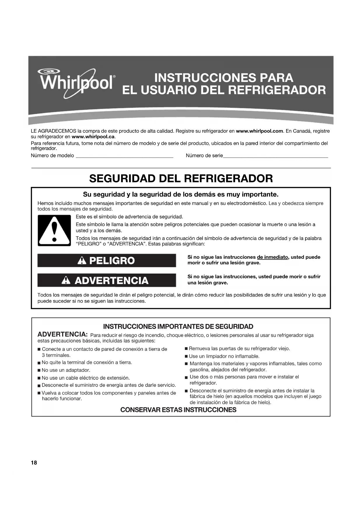 removidos, alterados o no identificados con facilidad. El costo de la reparación o del reemplazo bajo estas circunstancias excluidas correrá por cuenta del cliente. EXCLUSIÓN DE GARANTÍAS IMPLÍCITAS LAS GARANTÍAS IMPLÍCITAS, INCLUYENDO CUALQUIER GARANTÍA IMPLÍCITA DE COMERCIABILIDAD O GARANTÍA IMPLÍCITA DE CAPACIDAD PARA UN PROPÓSITO PARTICULAR, SERÁN LIMITADAS A UN AÑO O AL PERÍODO MÁS CORTO PERMITIDO POR LEY. Algunos estados y provincias no permiten la limitación de la duración de las garantías implícitas de comerciabilidad o capacidad, de modo que la limitación arriba indicada quizá no le corresponda. Esta garantía le otorga derechos legales específicos y es posible que usted tenga también otros derechos que varían de un estado a otro o de una provincia a otra. EXCLUSIÓN DE DECLARACIONES FUERA DE LA GARANTÍA Whirlpool no hace declaraciones acerca de la calidad, durabilidad o necesidad de servicio técnico o reparación de este electrodoméstico principal aparte de las declaraciones incluidas en esta garantía. Si usted desea una garantía con una duración más prolongada o más completa que la garantía limitada que se incluye con este electrodoméstico principal, deberá dirigirse a Whirlpool o a su distribuidor acerca de la compra de una garantía extendida. LIMITACIÓN DE RECURSOS; EXCLUSIÓN DE DAÑOS INCIDENTALES Y CONSECUENTES SU ÚNICO Y EXCLUSIVO RECURSO SEGÚN LOS TÉRMINOS DE ESTA GARANTÍA LIMITADA SERÁ EL DE REPARAR EL PRODUCTO SEGÚN SE ESTIPULA EN LA PRESENTE. WHIRLPOOL NO SE RESPONSABILIZARÁ POR DAÑOS INCIDENTALES O CONSECUENTES. Algunos estados y provincias no permiten la exclusión o limitación de daños incidentales o consecuentes, de modo que estas limitaciones y exclusiones quizás no le correspondan. Esta garantía le otorga derechos legales específicos y es posible que usted tenga también otros derechos que varían de un estado a otro o de una provincia a otra.37 Nous vous REMERCIONS d'avoir acheté ce produit de haute qualité. Enregistrer votre nouveau réfrigérateur sur le site internet www.whirlpool.ca. Pour référence ultérieure, consigner par écrit les numéros de modèle et de série de votre produit. Ceux-ci sont situés sur la paroi interne du compartiment de réfrigération. Numéro de modèle _______________________________________ Numéro de série__________________________________________