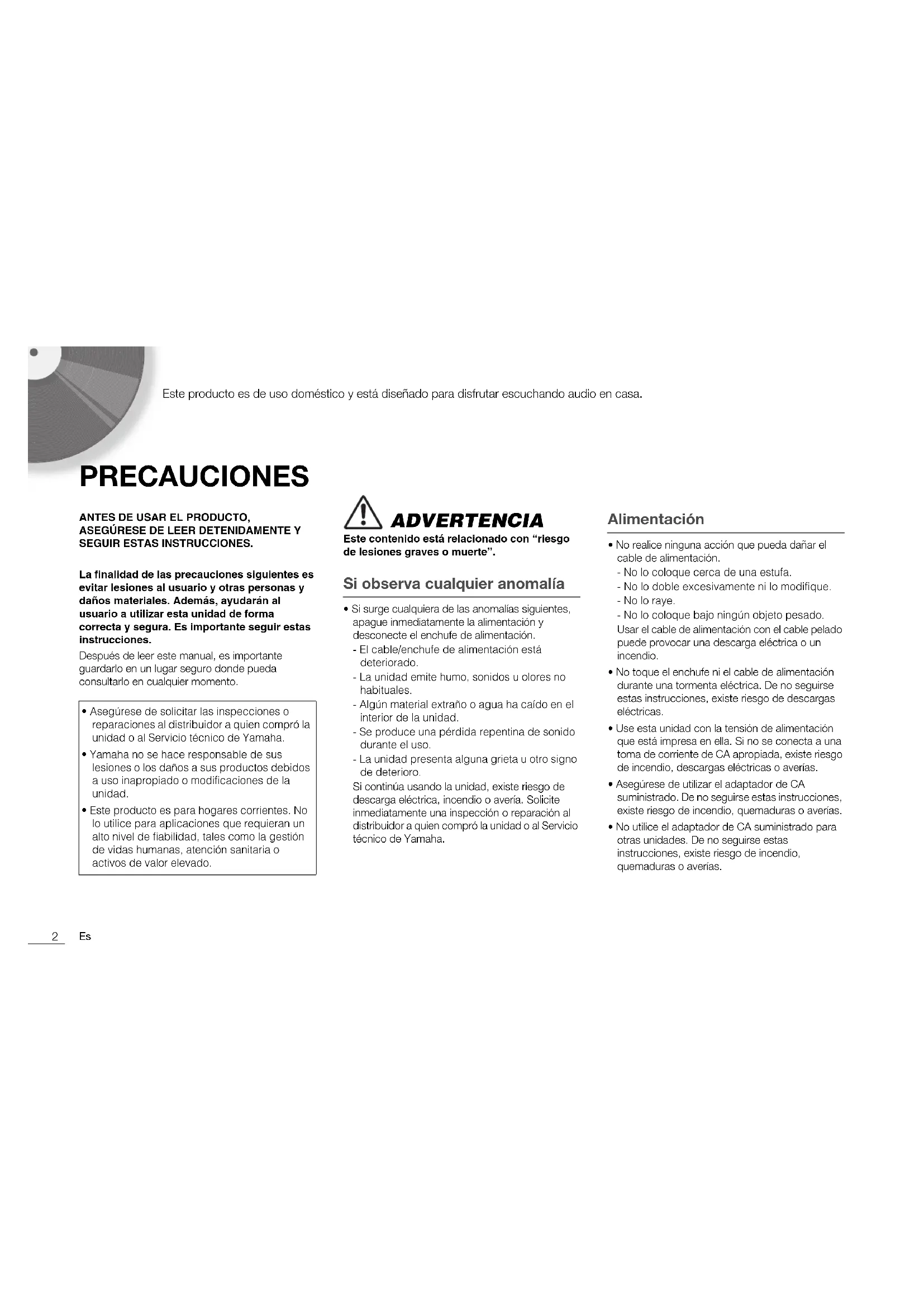 - Si surge cualquiera de las anomalías siguientes, apague inmediatamente la alimentación y desconecte el enchufe de alimentación. - El cable/enchufe de alimentación está deteriorado. - La unidad emite humo, sonidos u olores no habituales. - Algún material extraño o agua ha caído en el interior de la unidad. - Se produce una pérdida repentina de sonido durante el uso. - La unidad presenta alguna grieta u otro signo de deterioro. Si continúa usando la unidad, existe riesgo de descarga eléctrica, incendio o avería. Solicite inmediatamente una inspección o reparación al distribuidor a quien compró la unidad o al Servicio técnico de Yamaha. Alimentación