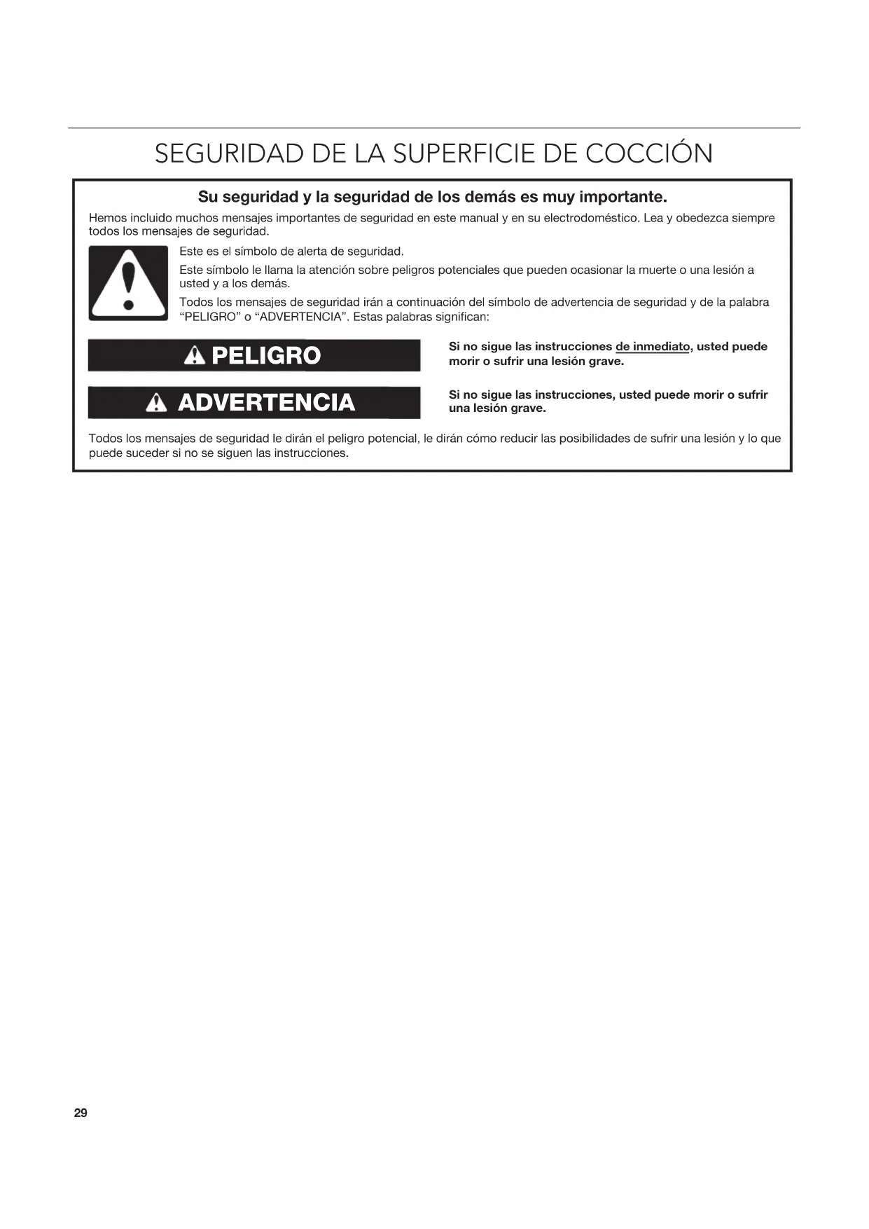 - En México SEGURIDAD DE LA SUPERFICIE DE COCCIÓN Si no sigue las instrucciones de inmediato, usted puede morir o sufrir una lesión grave. Si no sigue las instrucciones, usted puede morir o sufrir una lesión grave. Todos los mensajes de seguridad le dirán el peligro potencial, le dirán cómo reducir las posibilidades de sufrir una lesión y lo que puede suceder si no se siguen las instrucciones. Su seguridad y la seguridad de los demás es muy importante. Hemos incluido muchos mensajes importantes de seguridad en este manual y en su electrodoméstico. Lea y obedezca siempre todos los mensajes de seguridad. ADVERTENCIA PELIGRO Este es el símbolo de alerta de seguridad. Este símbolo le llama la atención sobre peligros potenciales que pueden ocasionar la muerte o una lesión a usted y a los demás. Todos los mensajes de seguridad irán a continuación del símbolo de advertencia de seguridad y de la palabra “PELIGRO” o “ADVERTENCIA”. Estas palabras significan:30 p. 4029