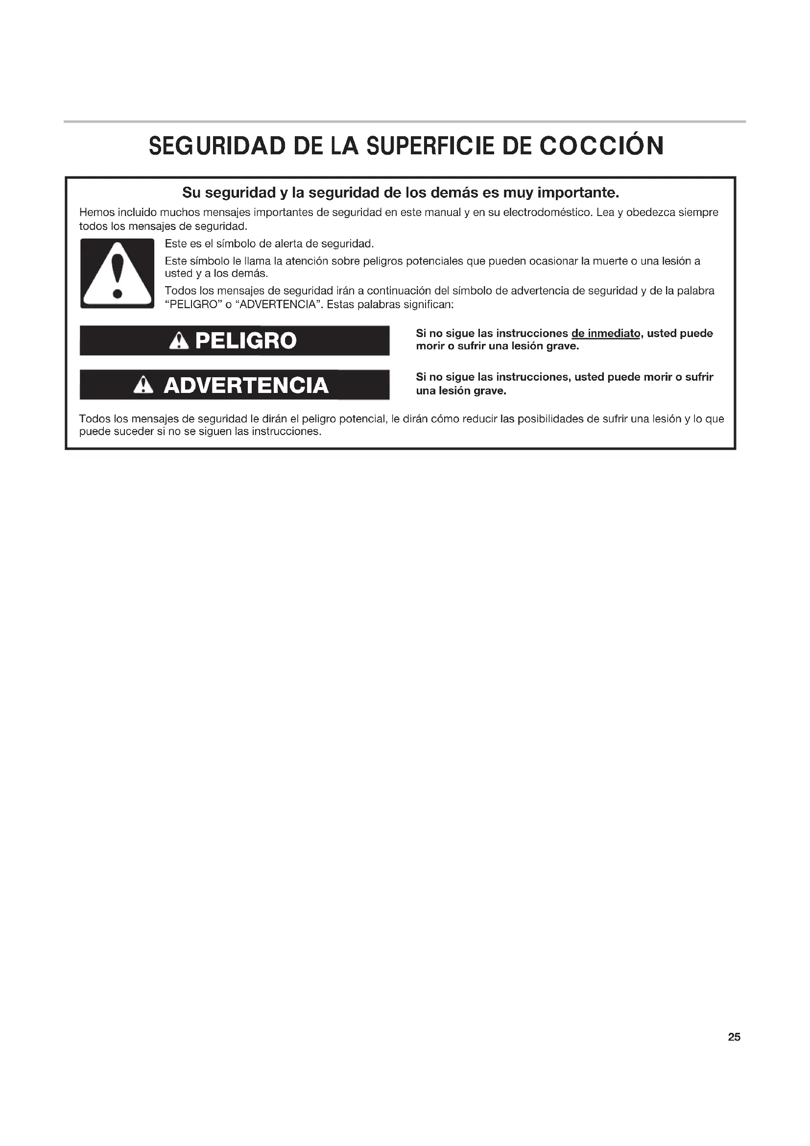 En Estados Unidos .....................................................................35 En Canadá ..................................................................................35 Accesorios ..................................................................................3525 SEGURIDAD DE LA SUPERFICIE DE COCCIÓN Si no sigue las instrucciones de inmediato, usted puede morir o sufrir una lesión grave. Si no sigue las instrucciones, usted puede morir o sufrir una lesión grave. Todos los mensajes de seguridad le dirán el peligro potencial, le dirán cómo reducir las posibilidades de sufrir una lesión y lo que puede suceder si no se siguen las instrucciones. Su seguridad y la seguridad de los demás es muy importante. Hemos incluido muchos mensajes importantes de seguridad en este manual y en su electrodoméstico. Lea y obedezca siempre todos los mensajes de seguridad. ADVERTENCIA PELIGRO Este es el símbolo de alerta de seguridad. Este símbolo le llama la atención sobre peligros potenciales que pueden ocasionar la muerte o una lesión a usted y a los demás. Todos los mensajes de seguridad irán a continuación del símbolo de advertencia de seguridad y de la palabra “PELIGRO” o “ADVERTENCIA”. Estas palabras significan:26