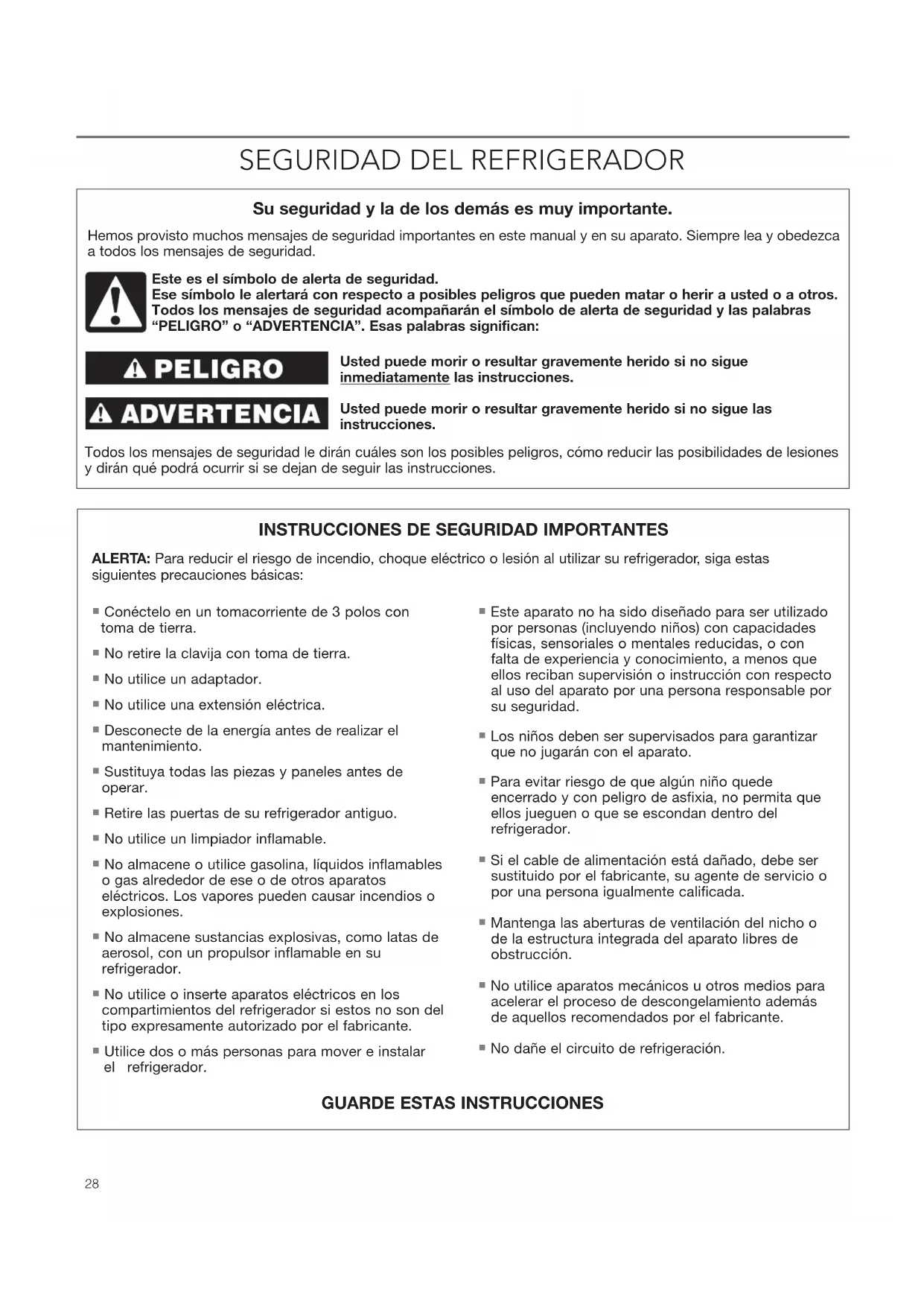 ALERTA: Para reducir el riesgo de incendio, choque eléctrico o lesión al utilizar su refrigerador, siga estas siguientes precauciones básicas: Este es el símbolo de alerta de seguridad. Ese símbolo le alertará con respecto a posibles peligros que pueden matar o herir a usted o a otros. Todos los mensajes de seguridad acompañarán el símbolo de alerta de seguridad y las palabras “PELIGRO” o “ADVERTENCIA”. Esas palabras significan: Conéctelo en un tomacorriente de 3 polos con toma de tierra. No retire la clavija con toma de tierra. No utilice un adaptador. No utilice una extensión eléctrica. Desconecte de la energía antes de realizar el mantenimiento. Sustituya todas las piezas y paneles antes de operar. Retire las puertas de su refrigerador antiguo. No utilice un limpiador inflamable. No almacene o utilice gasolina, líquidos inflamables o gas alrededor de ese o de otros aparatos eléctricos. Los vapores pueden causar incendios o explosiones. No almacene sustancias explosivas, como latas de aerosol, con un propulsor inflamable en su refrigerador. No utilice o inserte aparatos eléctricos en los compartimientos del refrigerador si estos no son del tipo expresamente autorizado por el fabricante. Utilice dos o más personas para mover e instalar el refrigerador. Este aparato no ha sido diseñado para ser utilizado por personas (incluyendo niños) con capacidades físicas, sensoriales o mentales reducidas, o con falta de experiencia y conocimiento, a menos que ellos reciban supervisión o instrucción con respecto al uso del aparato por una persona responsable por su seguridad. Los niños deben ser supervisados para garantizar que no jugarán con el aparato. Para evitar riesgo de que algún niño quede encerrado y con peligro de asfixia, no permita que ellos jueguen o que se escondan dentro del refrigerador. Si el cable de alimentación está dañado, debe ser sustituido por el fabricante, su agente de servicio o por una persona igualmente calificada. Mantenga las aberturas de ventilación del nicho o de la estructura integrada del aparato libres de obstrucción. No utilice aparatos mecánicos u otros medios para acelerar el proceso de descongelamiento además de aquellos recomendados por el fabricante. No dañe el circuito de refrigeración.
