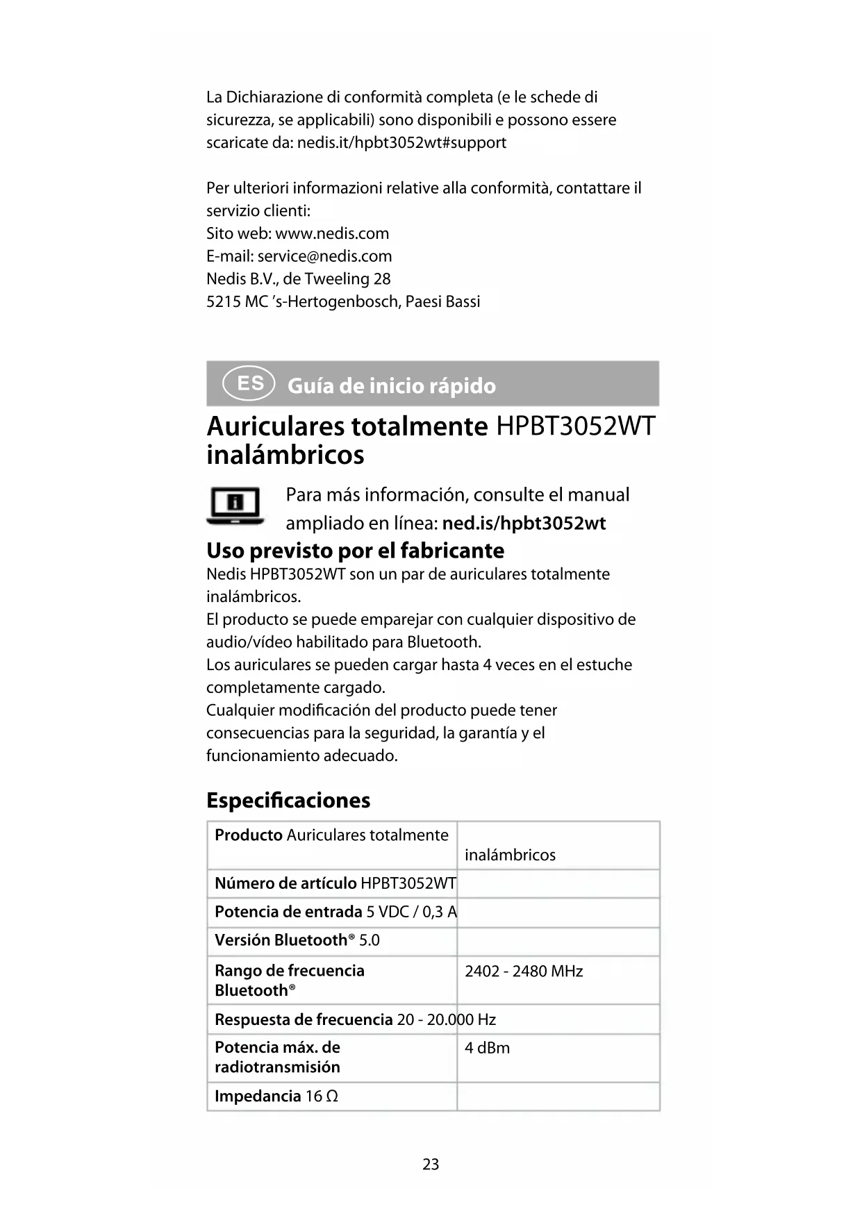 Guía de inicio rápido Auriculares totalmente inalámbricos HPBT3052WT Para más información, consulte el manual ampliado en línea: ned.is/hpbt3052wt Uso previsto por el fabricante Nedis HPBT3052WT son un par de auriculares totalmente inalámbricos. El producto se puede emparejar con cualquier dispositivo de audio/vídeo habilitado para Bluetooth. Los auriculares se pueden cargar hasta 4 veces en el estuche completamente cargado. Cualquier modicación del producto puede tener consecuencias para la seguridad, la garantía y el funcionamiento adecuado. Especicaciones Producto Auriculares totalmente inalámbricos Número de artículo HPBT3052WT Potencia de entrada 5 VDC / 0,3 A Versión Bluetooth® 5.0 Rango de frecuencia Bluetooth® 2402 - 2480 MHz Respuesta de frecuencia 20 - 20.000 Hz Potencia máx. de radiotransmisión 4 dBm Impedancia 16 Ω24 Tamaño del controlador 10 mm Control por voz Siri, asistente de Google Tipo de batería Polímero de litio (auriculares) Polímero de litio (estuche de carga) Tiempo de carga Hasta 2 horas Recargas en el estuche Hasta 4 veces Capacidad de la batería de los auriculares 2 x 30 mAh Capacidad de la batería del estuche de carga 300 mAh Tiempo de reproducción Hasta 2,5 horas Impermeabilidad No Partes principales (imagen A)