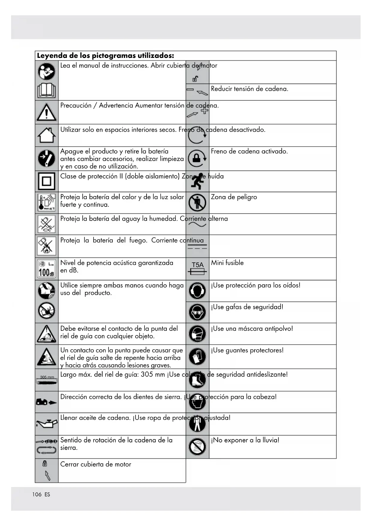 Proteja la batería del aguay la humedad. Corriente alterna Proteja la batería del fuego. Corriente continua Nivel de potencia acústica garantizada en dB. T5A Mini fusible Utilice siempre ambas manos cuando haga uso del producto. ¡Use protección para los oídos! ¡Use gafas de seguridad! Debe evitarse el contacto de la punta del riel de guía con cualquier objeto. ¡Use una máscara antipolvo! Un contacto con la punta puede causar que el riel de guía salte de repente hacia arriba y hacia atrás causando lesiones graves. ¡Use guantes protectores! 305 mm Largo máx. del riel de guía: 305 mm ¡Use calzado de seguridad antideslizante! Dirección correcta de los dientes de sierra. ¡Use protección para la cabeza! Llenar aceite de cadena. ¡Use ropa de protección ajustada! Sentido de rotación de la cadena de la sierra. ¡No exponer a la lluvia! Cerrar cubierta de motor