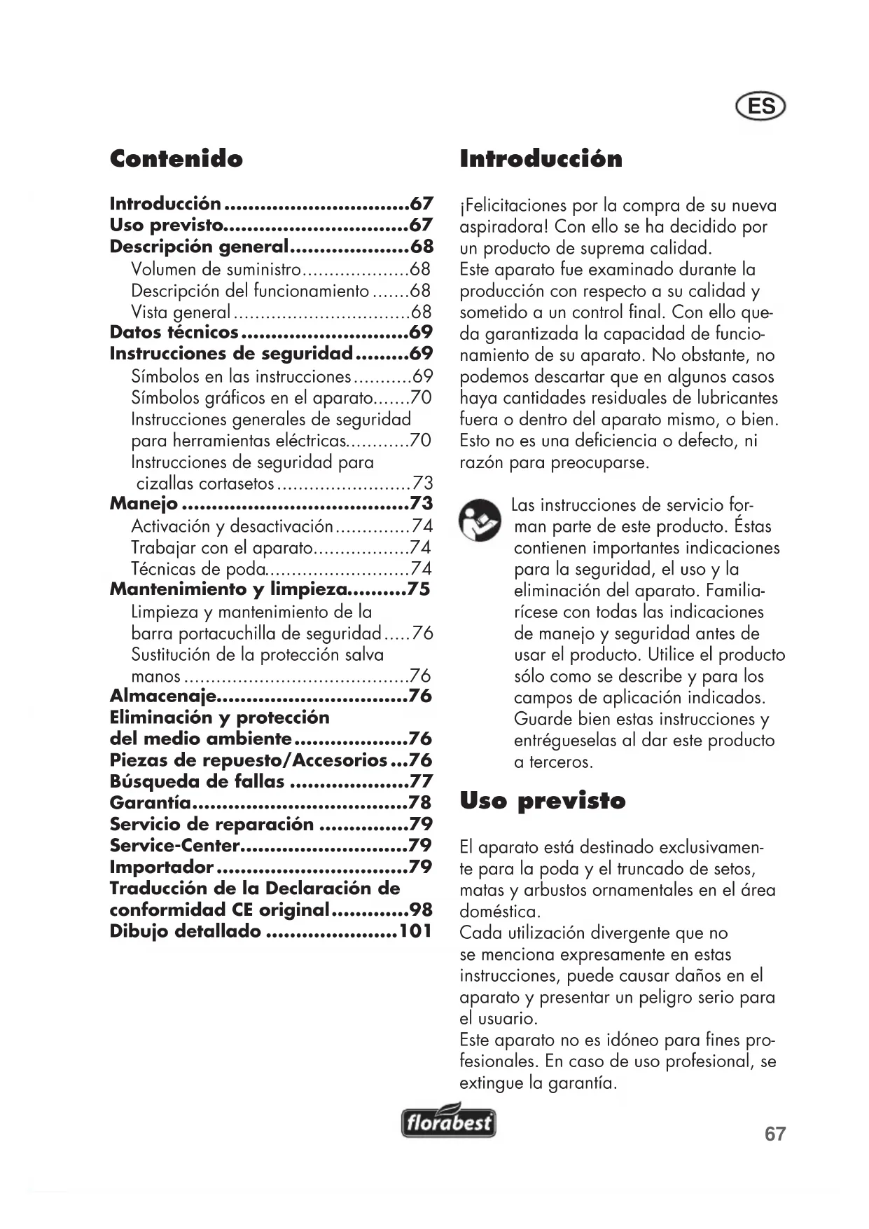 Introducción ¡Felicitaciones por la compra de su nueva aspiradora! Con ello se ha decidido por un producto de suprema calidad. Este aparato fue examinado durante la producción con respecto a su calidad y sometido a un control nal. Con ello que- da garantizada la capacidad de funcio- namiento de su aparato. No obstante, no podemos descartar que en algunos casos haya cantidades residuales de lubricantes fuera o dentro del aparato mismo, o bien. Esto no es una deciencia o defecto, ni razón para preocuparse. Las instrucciones de servicio for- man parte de este producto. Éstas contienen importantes indicaciones para la seguridad, el uso y la eliminación del aparato. Familia- rícese con todas las indicaciones de manejo y seguridad antes de usar el producto. Utilice el producto sólo como se describe y para los campos de aplicación indicados. Guarde bien estas instrucciones y entrégueselas al dar este producto a terceros. Uso previsto El aparato está destinado exclusivamen- te para la poda y el truncado de setos, matas y arbustos ornamentales en el área doméstica. Cada utilización divergente que no se menciona expresamente en estas instrucciones, puede causar daños en el aparato y presentar un peligro serio para el usuario. Este aparato no es idóneo para nes pro- fesionales. En caso de uso profesional, se extingue la garantía. Contenido Introducción ...............................67 Uso previsto