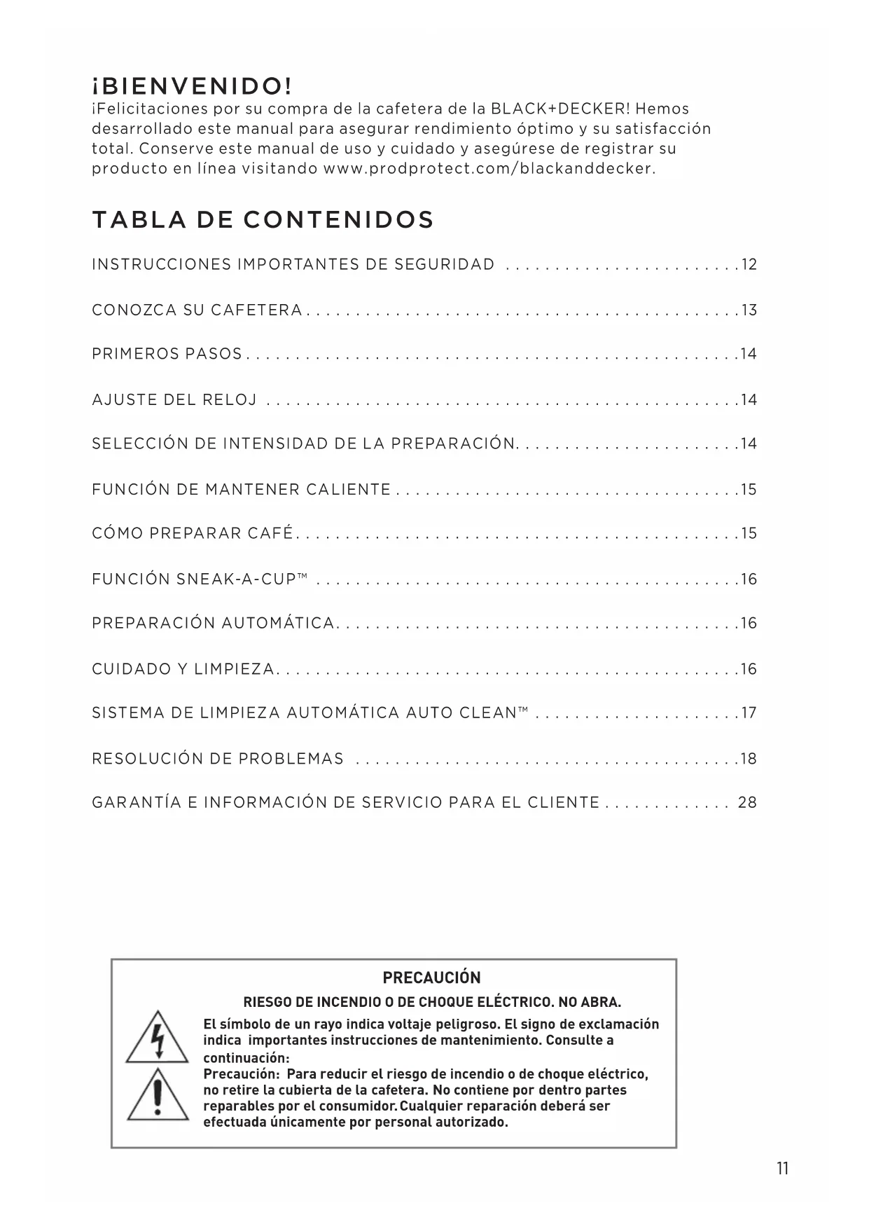 GARANTÍA E INFORMACIÓN DE SERVICIO PARA EL CLIENTE ............. 28 ¡BIENVENIDO! ¡Felicitaciones por su compra de la cafetera de la BLACK+DECKER! Hemos desarrollado este manual para asegurar rendimiento óptimo y su satisfacción total. Conserve este manual de uso y cuidado y asegúrese de registrar su producto en línea visitando www.prodprotect.com/blackanddecker. CM1251_CM1331_series_IB_27495.indd 11 1/28/20 11:43 AM12