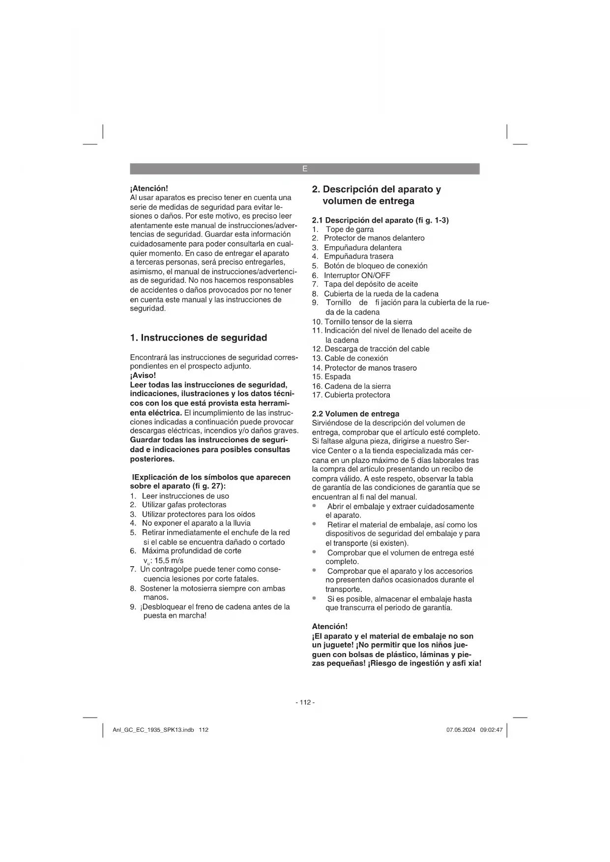 tor Freno del motor El motor frena la cadena de la sierra en cuanto se haya soltado el interruptor ON/OFF (fi g. 1/pos.6) o se haya interrumpido la alimentación eléctrica. Esto reduce signifi cativamente el riesgo de sufrir lesiones por la inercia de la cadena. Freno de cadena El freno de la cadena es un mecanismo de pro- tección que se activa a través del protector de manos delantero (fi g. 1/pos. 2). Si la motosierra sale despedida hacia atrás por un contragolpe se accionará el freno, deteniéndose la cadena de la sierra en menos de 0,1 segundos. Comprobar con regularidad la operatividad del freno de cade- na. A tal efecto, plegar el protector de manos (fi g. 1/pos. 2) hacia delante y conectar la motosierra durante un breve espacio de tiempo. La cadena de la sierra no deberá ponerse en marcha. Para soltar el freno de la cadena tirar hacia atrás del protector de manos delantero (fi g. 1/pos. 2), hasta que encaje. ¡Atención! No utilizar la sierra si no funcionan perfectamente los dispositivos de protección. No intentar reparar uno. mismo los dispositivos de protección relevantes desde el punto de vista de la seguridad; dirigirse para ello a nuestro servicio posventa o a un taller similar especializado. Protector de manos El protector de manos delantero (a la vez freno de cadena) (fi g. 1/pos. 2) y el protector de ma- nos trasero (fi g. 2/ pos. 14) protegen los dedos evitando lesiones por contacto con la cadena de la sierra, en caso de que ésta se rompiera por sobrecarga. Anl_GC_EC_1935_SPK13.indb 115Anl_GC_EC_1935_SPK13.indb 115 07.05.2024 09:02:4807.05.2024 09:02:48E