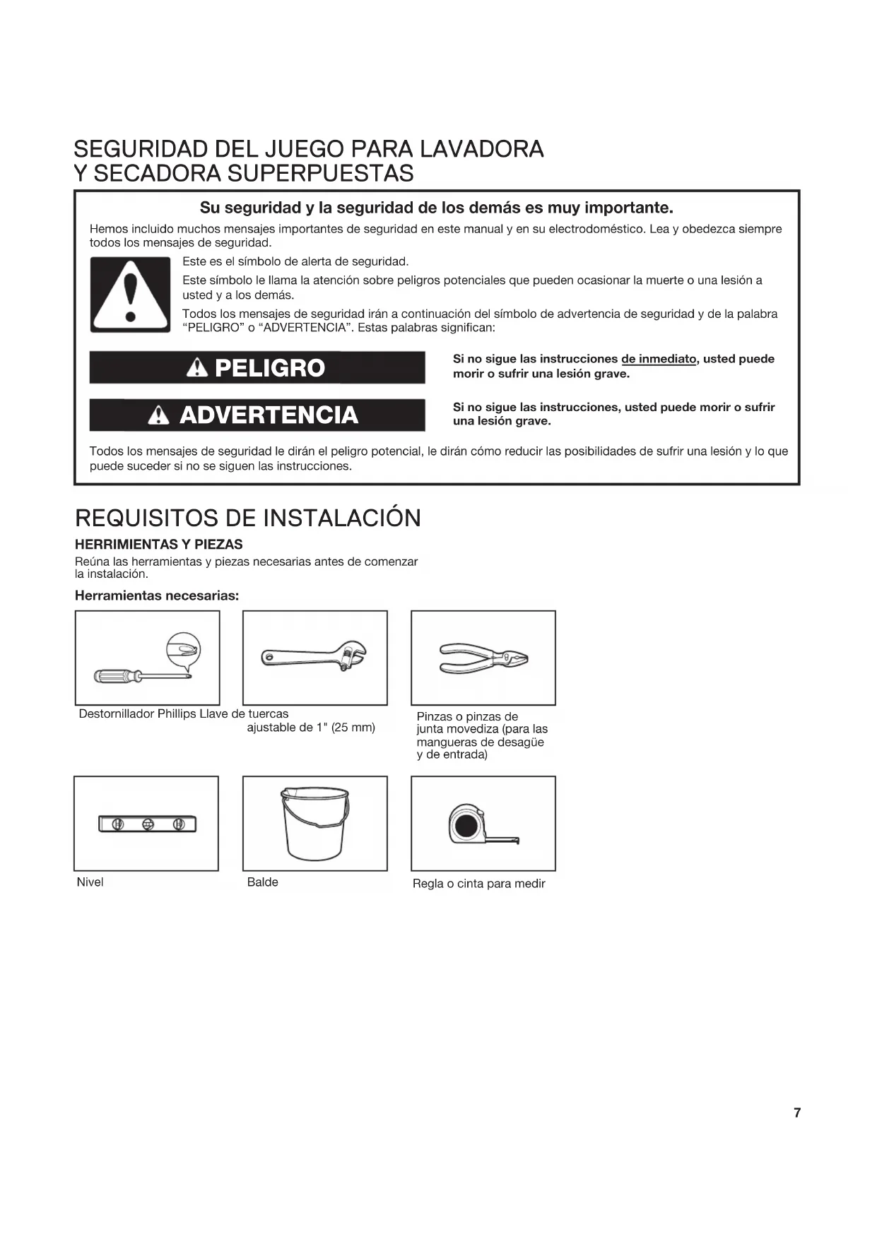 ⁄2" Máx. (1765 mm)9 CÓMO DESINSTALAR LAVADORA Y LA SECADORA IMPORTANTE: Si su lavadora y secadora ya están instaladas, deben ser desinstaladas. Si necesita desinstalar su lavadora o secadora, vea las herramientas necesarias en las Instrucciones de Instalación que vinieron con su modelo. Cómo desinstalar su lavadora