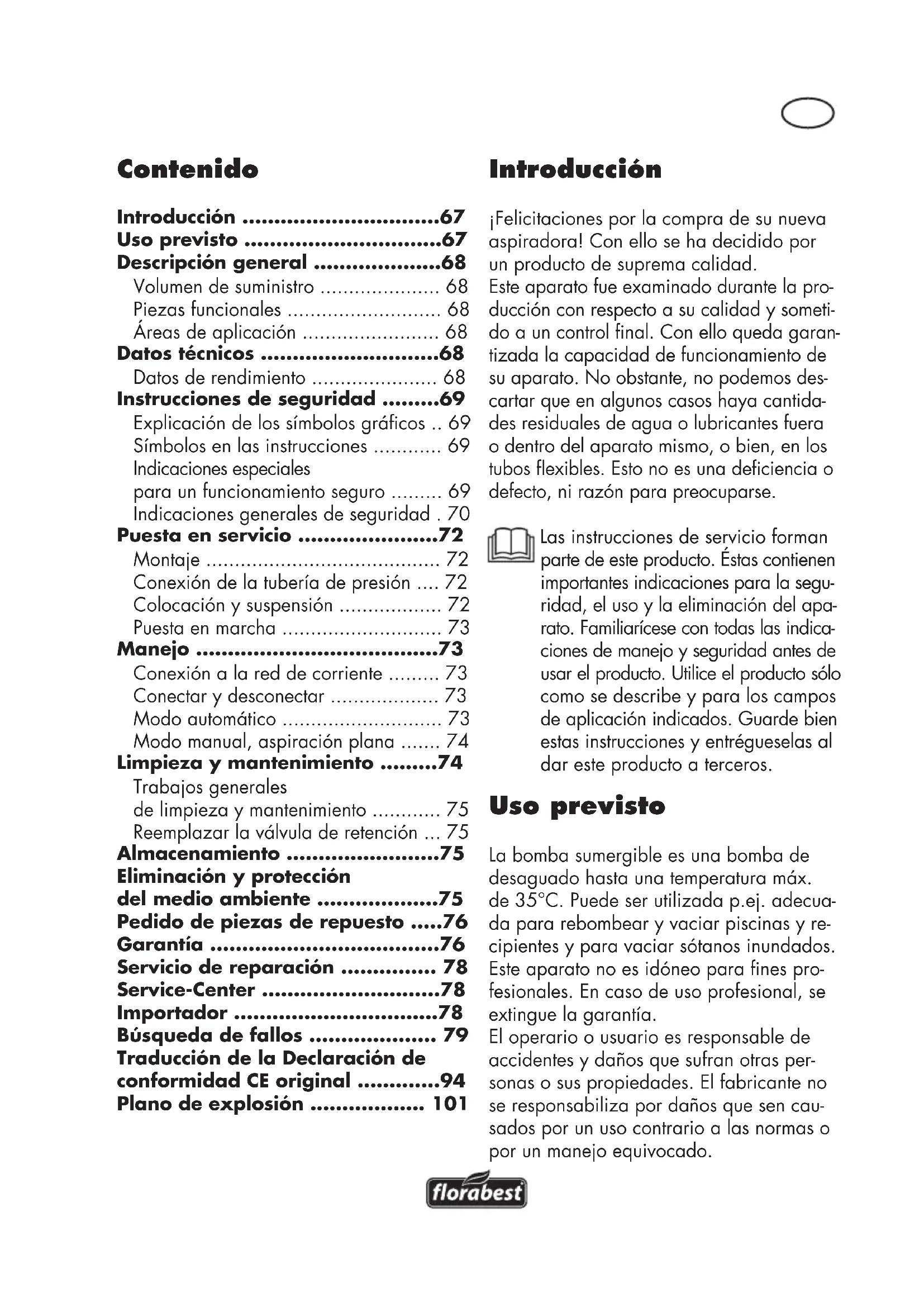 - Tenga en cuenta que la bomba no es adecuada para funcionar de forma permanente (p.ej. para cursos de agua en em- balses de jardín). Compruebe periódicamente que el aparato funcione perfectamente.