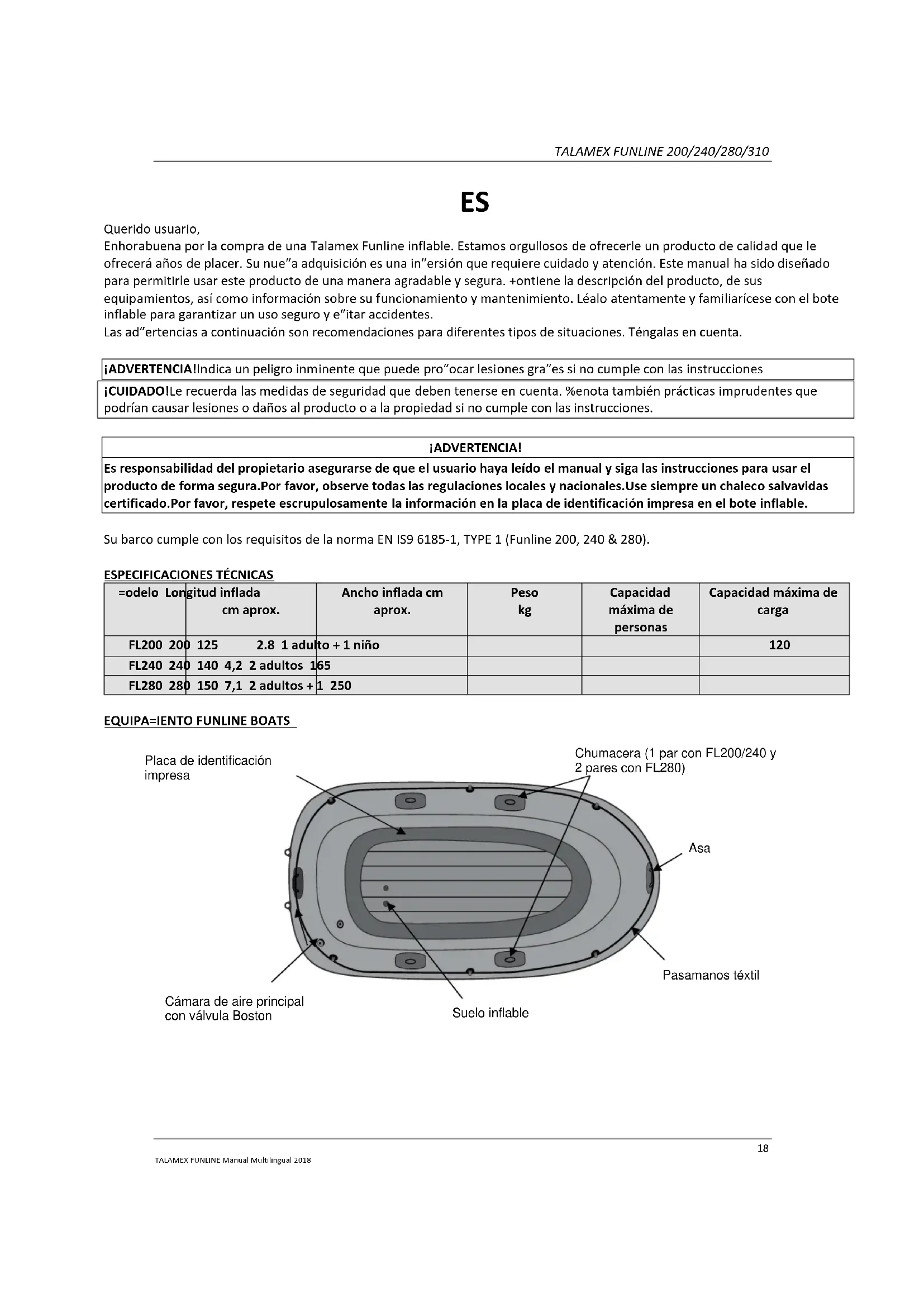 Querido usuario, Enhorabuena por la compra de una Talamex Funline inflable. Estamos orgullosos de ofrecerle un producto de calidad que le ofrecerá años de placer. Su nueva adquisición es una inversión que requiere cuidado y atención. Este manual ha sido diseñado para permitirle usar este producto de una manera agradable y segura. Contiene la descripción del producto, de sus equipamientos, así como información sobre su funcionamiento y mantenimiento. Léalo atentamente y familiarícese con el bote inflable para garantizar un uso seguro y evitar accidentes. Las advertencias a continuación son recomendaciones para diferentes tipos de situaciones. Téngalas en cuenta. ¡ADVERTENCIA!Indica un peligro inminente que puede provocar lesiones graves si no cumple con las instrucciones ¡CUIDADO!Le recuerda las medidas de seguridad que deben tenerse en cuenta. Denota también prácticas imprudentes que podrían causar lesiones o daños al producto o a la propiedad si no cumple con las instrucciones. ¡ADVERTENCIA! Es responsabilidad del propietario asegurarse de que el usuario haya leído el manual y siga las instrucciones para usar el producto de forma segura.Por favor, observe todas las regulaciones locales y nacionales.Use siempre un chaleco salvavidas certificado.Por favor, respete escrupulosamente la información en la placa de identificación impresa en el bote inflable. Su barco cumple con los requisitos de la norma EN ISO 6185-1, TYPE 1 (Funline 200, 240 & 280).