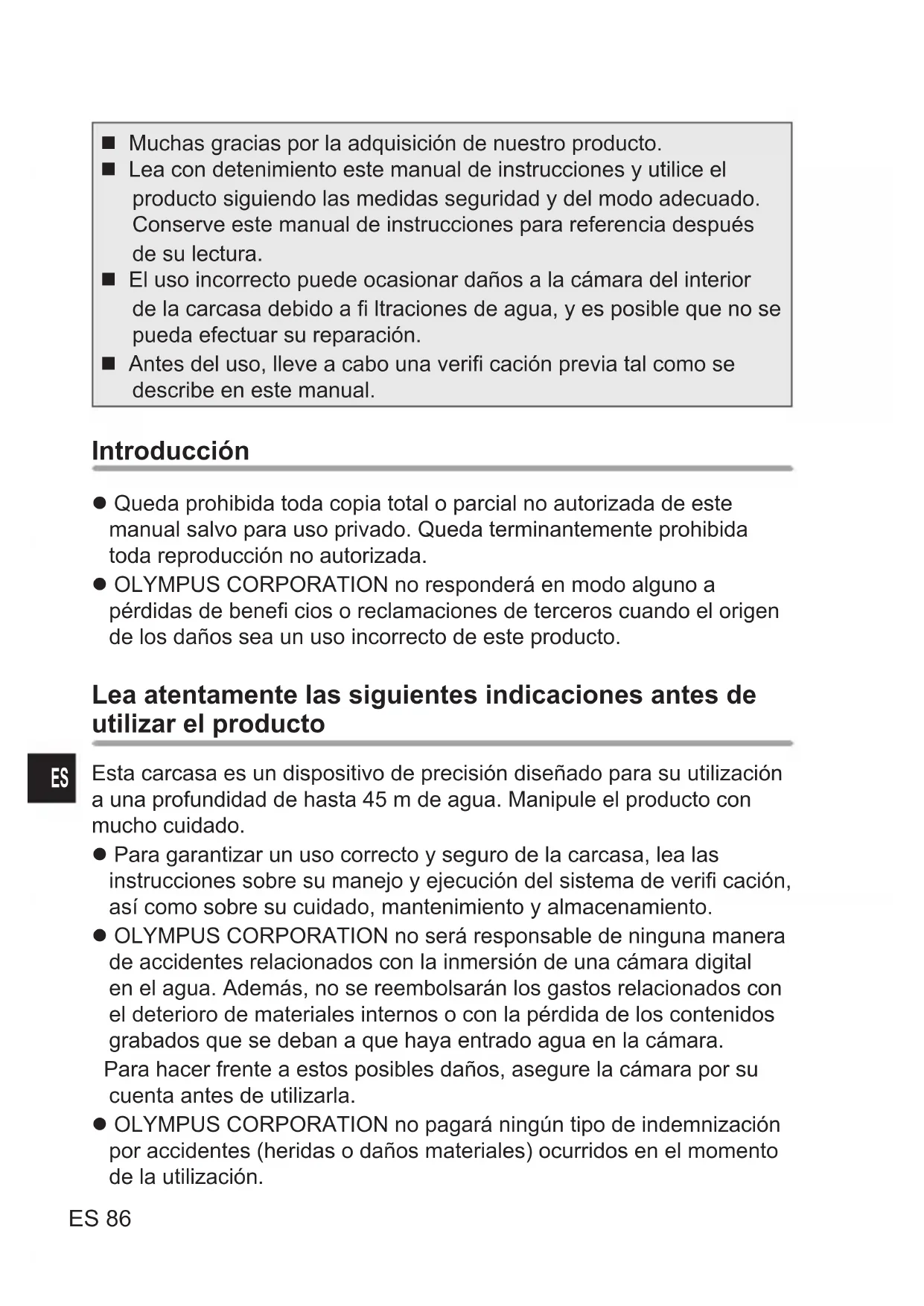 Muchas gracias por la adquisición de nuestro producto. Lea con detenimiento este manual de instrucciones y utilice el producto siguiendo las medidas seguridad y del modo adecuado. Conserve este manual de instrucciones para referencia después de su lectura. El uso incorrecto puede ocasionar daños a la cámara del interior de la carcasa debido a fi ltraciones de agua, y es posible que no se pueda efectuar su reparación. Antes del uso, lleve a cabo una verifi cación previa tal como se describe en este manual. Introducción Queda prohibida toda copia total o parcial no autorizada de este manual salvo para uso privado. Queda terminantemente prohibida toda reproducción no autorizada. OLYMPUS CORPORATION no responderá en modo alguno a pérdidas de benefi cios o reclamaciones de terceros cuando el origen de los daños sea un uso incorrecto de este producto. Lea atentamente las siguientes indicaciones antes de utilizar el producto Esta carcasa es un dispositivo de precisión diseñado para su utilización a una profundidad de hasta 45 m de agua. Manipule el producto con mucho cuidado. Para garantizar un uso correcto y seguro de la carcasa, lea las instrucciones sobre su manejo y ejecución del sistema de verifi cación, así como sobre su cuidado, mantenimiento y almacenamiento. OLYMPUS CORPORATION no será responsable de ninguna manera de accidentes relacionados con la inmersión de una cámara digital en el agua. Además, no se reembolsarán los gastos relacionados con el deterioro de materiales internos o con la pérdida de los contenidos grabados que se deban a que haya entrado agua en la cámara. Para hacer frente a estos posibles daños, asegure la cámara por su cuenta antes de utilizarla. OLYMPUS CORPORATION no pagará ningún tipo de indemnización por accidentes (heridas o daños materiales) ocurridos en el momento de la utilización.ES 87