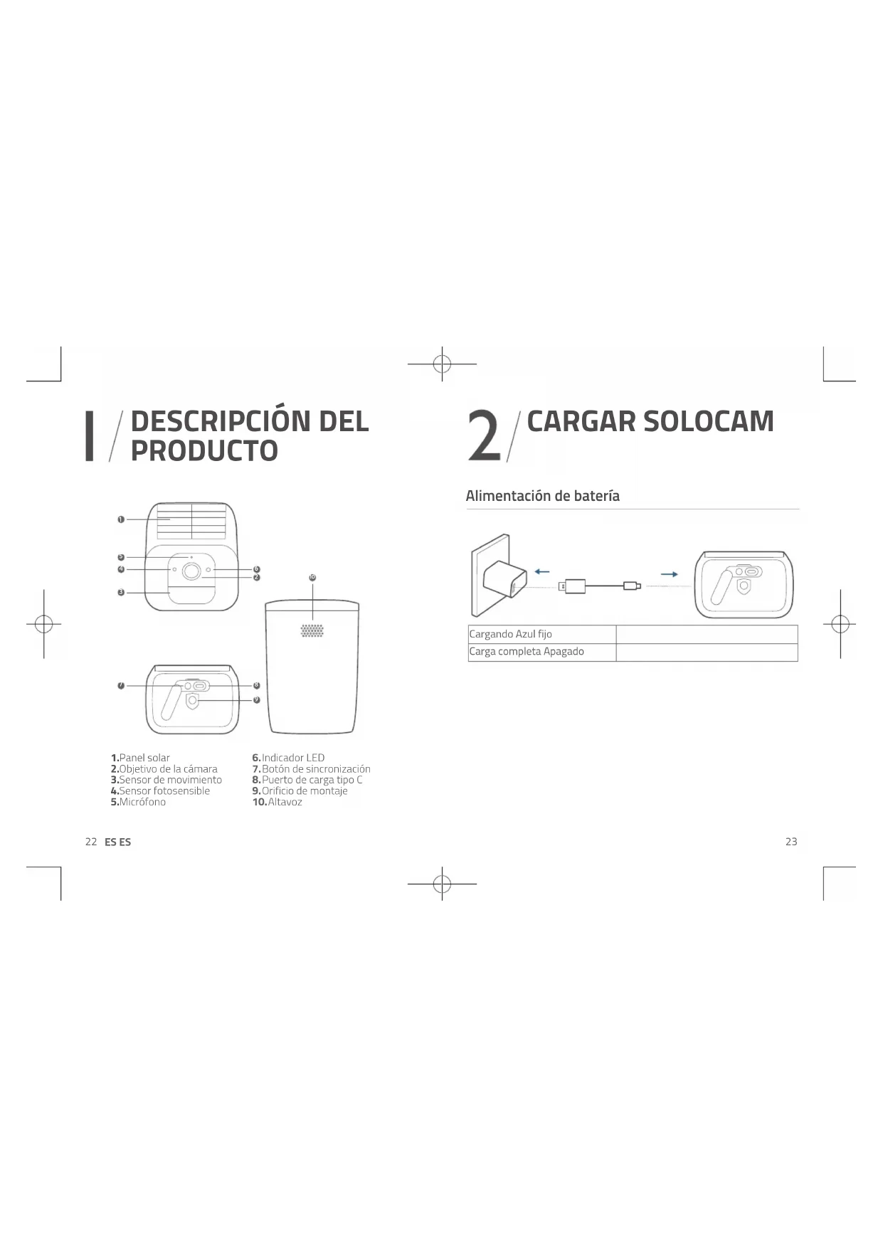 CARGAR SOLOCAM Alimentación de batería Cargando Azul fijo Carga completa Apagado24 ES ES