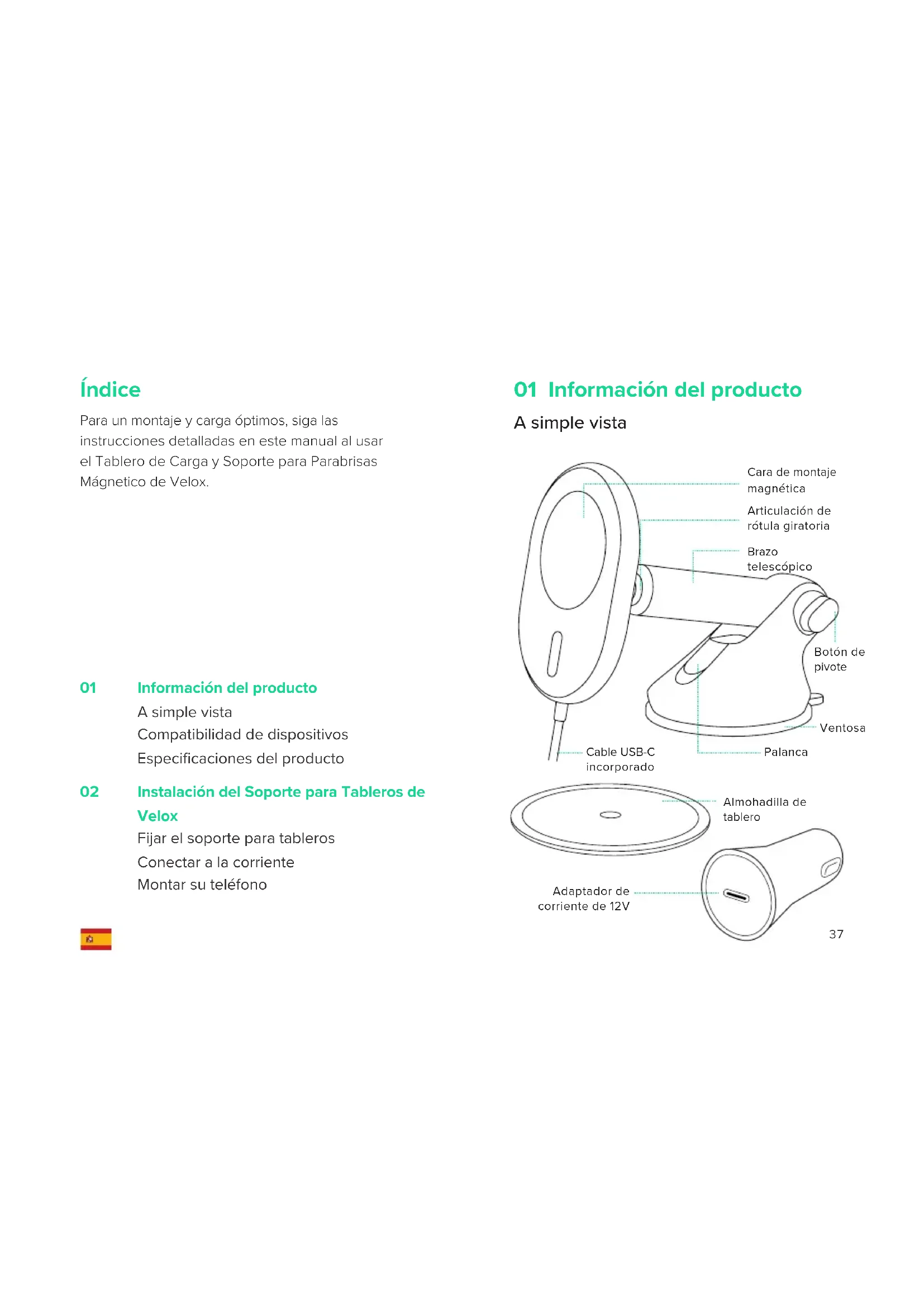 - Tenga cuidado al retirar la almohadilla del tablero. Recomendamos retirarla lentamente desde el borde para evitar dañarla. 02 Instalación de la Montura para Tablero de Velox *Si su vehículo tiene un tablero de piel, recomendamos el montaje en el parabrisas para evitar hacerle daño a su tablero.4342 ES Para volver a usar la ventosa, simplemente enjuáguela con agua tibia y deje que se seque al aire para que recupere su succión pegajosa. Información adicional Opción B Instalación en el parabrisas Elija una ubicación en el parabrisas y limpie el polvo o residuos que puedan haber en su superficie. Conectar a la corriente eléctrica Conecte el cable USB-C incorporado al adaptador de 12V incluido y enchufe el adaptador a la toma eléctrica auxiliar de su vehículo. Montar su teléfono Simplemente toque la montura con su teléfono y los imanes lo mantendrán en su sitio. La carga comenzará de forma automática. Ya esta listo para empezar a manejar. *El soporte para tableros de Velox no tiene un interruptor de encendido/apagado. Una vez que el cable esté enchufado y el se encienda el vehículo, la montura se mantendrá activada. *La almohadilla del tablero no se recomienda para el montaje en el parabrisas. *El brazo telescópico va de 10 cm a 15 cm.