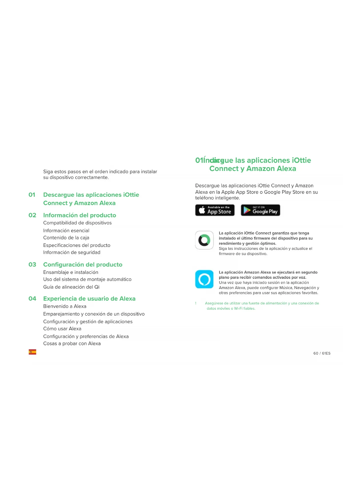 - Para desvincular el dispositivo, mantenga presionado el botón Invocar Alexa durante 5 segundos hasta que parpadee en naranja, y seleccione “Olvidar dispositivo” en la configuración de Bluetooth del teléfono. Actualización del firmware del dispositivo a través de la aplicación iOttie Connect Para una experiencia de usuario óptima, asegúrese de tener instalado el firmware más actualizado del dispositivo desde la aplicación iOttie Connect. Siga las instrucciones para actualizar el firmware del dispositivo en la aplicación. 70 /71ESCómo usar Alexa