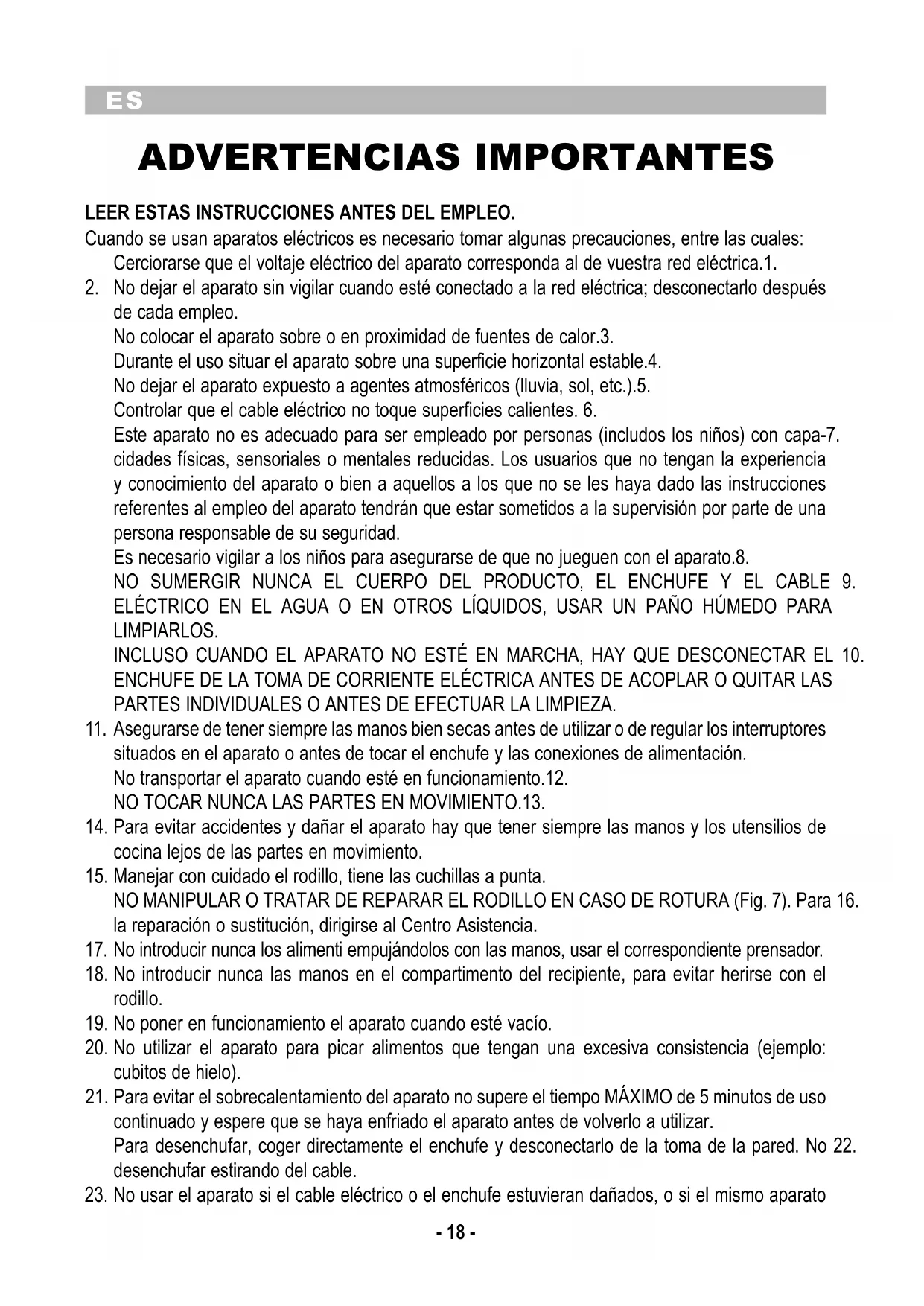 ADVERTENCIAS IMPORTANTES LEER ESTAS INSTRUCCIONES ANTES DEL EMPLEO. Cuando se usan aparatos eléctricos es necesario tomar algunas precauciones, entre las cuales: Cerciorarse que el voltaje eléctrico del aparato corresponda al de vuestra red eléctrica.1. No dejar el aparato sin vigilar cuando esté conectado a la red eléctrica; desconectarlo después 2. de cada empleo. No colocar el aparato sobre o en proximidad de fuentes de calor.3. Durante el uso situar el aparato sobre una superficie horizontal estable.4. No dejar el aparato expuesto a agentes atmosféricos (lluvia, sol, etc.).5. Controlar que el cable eléctrico no toque superficies calientes. 6. Este aparato no es adecuado para ser empleado por personas (includos los niños) con capa-7. cidades físicas, sensoriales o mentales reducidas. Los usuarios que no tengan la experiencia y conocimiento del aparato o bien a aquellos a los que no se les haya dado las instrucciones referentes al empleo del aparato tendrán que estar sometidos a la supervisión por parte de una persona responsable de su seguridad. Es necesario vigilar a los niños para asegurarse de que no jueguen con el aparato.8. NO SUMERGIR NUNCA EL CUERPO DEL PRODUCTO, EL ENCHUFE Y EL CABLE 9. ELÉCTRICO EN EL AGUA O EN OTROS LÍQUIDOS, USAR UN PAÑO HÚMEDO PARA LIMPIARLOS. INCLUSO CUANDO EL APARATO NO ESTÉ EN MARCHA, HAY QUE DESCONECTAR EL 10. ENCHUFE DE LA TOMA DE CORRIENTE ELÉCTRICA ANTES DE ACOPLAR O QUITAR LAS PARTES INDIVIDUALES O ANTES DE EFECTUAR LA LIMPIEZA. Asegurarse de tener siempre las manos bien secas antes de utilizar o de regular los interruptores 11. situados en el aparato o antes de tocar el enchufe y las conexiones de alimentación. No transportar el aparato cuando esté en funcionamiento.12. NO TOCAR NUNCA LAS PARTES EN MOVIMIENTO.13. Para evitar accidentes y dañar el aparato hay que tener siempre las manos y los utensilios de 14. cocina lejos de las partes en movimiento. Manejar con cuidado el rodillo, tiene las cuchillas a punta.15. NO MANIPULAR O TRATAR DE REPARAR EL RODILLO EN CASO DE ROTURA (Fig. 7). Para 16. la reparación o sustitución, dirigirse al Centro Asistencia. No introducir nunca los alimenti empujándolos con las manos, usar el correspondiente prensador.17. No introducir nunca las manos en el compartimento del recipiente, para evitar herirse con el 18. rodillo. No poner en funcionamiento el aparato cuando esté vacío.19. No utilizar el aparato para picar alimentos que tengan una excesiva consistencia (ejemplo: 20. cubitos de hielo). Para evitar el sobrecalentamiento del aparato no supere el tiempo MÁXIMO de 5 minutos de uso 21. continuado y espere que se haya enfriado el aparato antes de volverlo a utilizar. Para desenchufar, coger directamente el enchufe y desconectarlo de la toma de la pared. No 22. desenchufar estirando del cable. No usar el aparato si el cable eléctrico o el enchufe estuvieran dañados, o si el mismo aparato 23.ES