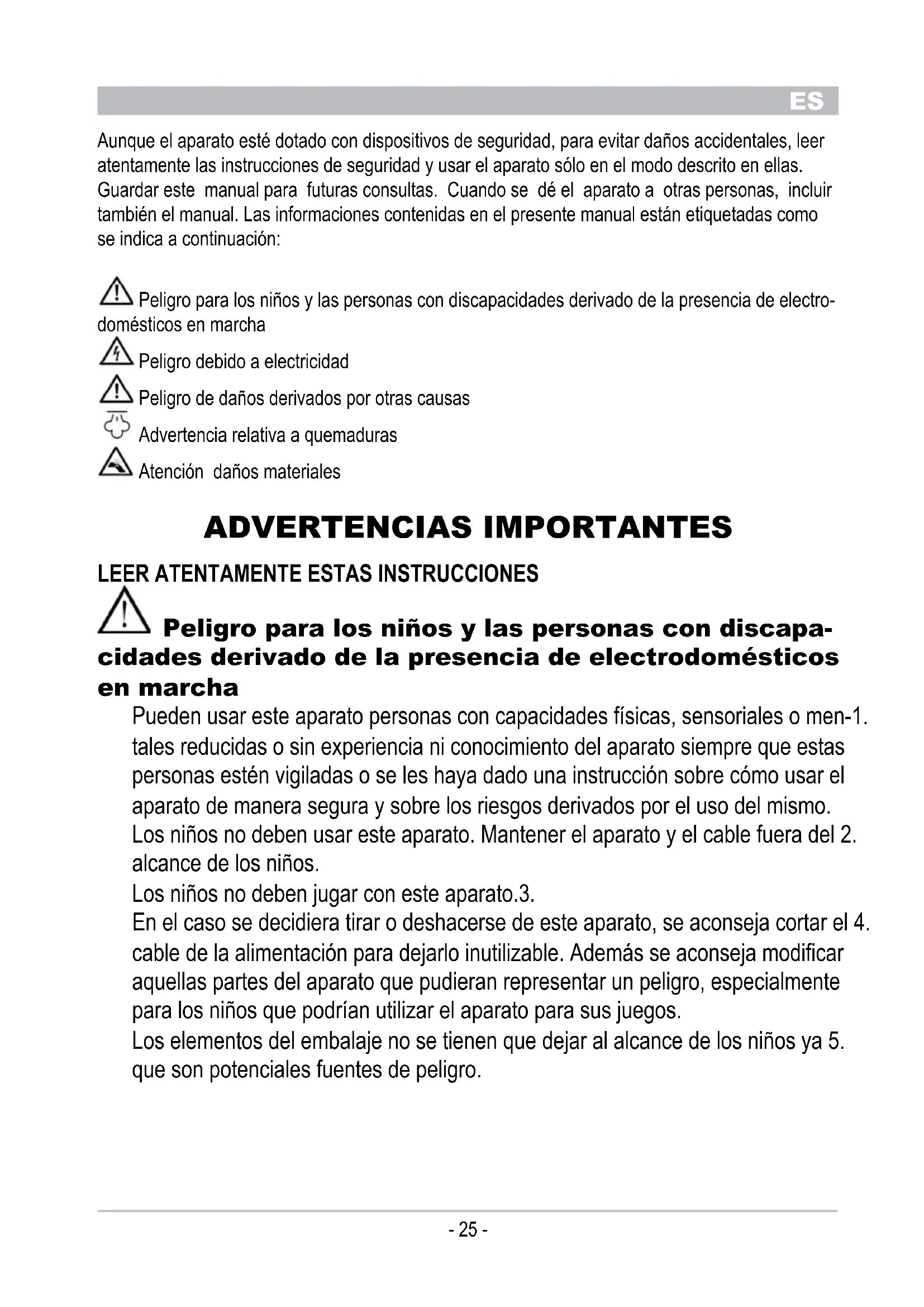 Aunque el aparato esté dotado con dispositivos de seguridad, para evitar daños accidentales, leer atentamente las instrucciones de seguridad y usar el aparato sólo en el modo descrito en ellas. Guardar este manual para futuras consultas. Cuando se dé el aparato a otras personas, incluir también el manual. Las informaciones contenidas en el presente manual están etiquetadas como se indica a continuación: Peligro para los niños y las personas con discapacidades derivado de la presencia de electro- domésticos en marcha Peligro debido a electricidad Peligro de daños derivados por otras causas Advertencia relativa a quemaduras Atención daños materiales ADVERTENCIAS IMPORTANTES lEER AtENtAMENtE EstAs INstRuCCIONEs Peligro para los niños y las personas con discapa- cidades derivado de la presencia de electrodomésticos en marcha Pueden usar este aparato personas con capacidades físicas, sensoriales o men-1. tales reducidas o sin experiencia ni conocimiento del aparato siempre que estas personas estén vigiladas o se les haya dado una instrucción sobre cómo usar el aparato de manera segura y sobre los riesgos derivados por el uso del mismo. Los niños no deben usar este aparato. Mantener el aparato y el cable fuera del 2. alcance de los niños. Los niños no deben jugar con este aparato.3. En el caso se decidiera tirar o deshacerse de este aparato, se aconseja cortar el 4. cable de la alimentación para dejarlo inutilizable. Además se aconseja modificar aquellas partes del aparato que pudieran representar un peligro, especialmente para los niños que podrían utilizar el aparato para sus juegos. Los elementos del embalaje no se tienen que dejar al alcance de los niños ya 5. que son potenciales fuentes de peligro.ES