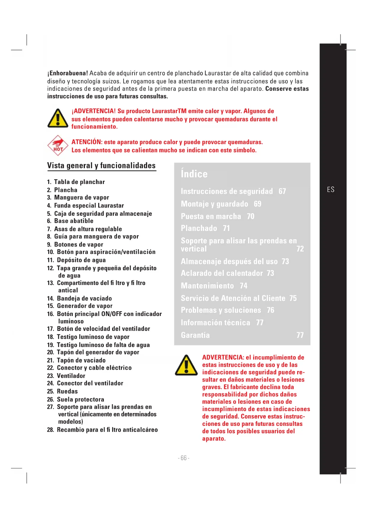 onale entrerà in vigore a partire dal giugno 2017.- 66 - ADVERTENCIA: el incumplimiento de estas instrucciones de uso y de las indicaciones de seguridad puede re- sultar en daños materiales o lesiones graves. El fabricante declina toda responsabilidad por dichos daños materiales o lesiones en caso de incumplimiento de estas indicaciones de seguridad. Conserve estas instruc- ciones de uso para futuras consultas de todos los posibles usuarios del aparato. ¡ADVERTENCIA! Su producto LaurastarTM emite calor y vapor. Algunos de sus elementos pueden calentarse mucho y provocar quemaduras durante el funcionamiento. ATENCIÓN: este aparato produce calor y puede provocar quemaduras. Los elementos que se calientan mucho se indican con este símbolo. Índice Instrucciones de seguridad 67 Montaje y guardado 69 Puesta en marcha 70 Planchado 71 Soporte para alisar las prendas en vertical 72 Almacenaje después del uso 73 Aclarado del calentador 73 Mantenimiento 74 Servicio de Atención al Cliente 75 Problemas y soluciones 76 Información técnica 77 Garantía 77 ¡Enhorabuena! Acaba de adquirir un centro de planchado Laurastar de alta calidad que combina diseño y tecnología suizos. Le rogamos que lea atentamente estas instrucciones de uso y las indicaciones de seguridad antes de la primera puesta en marcha del aparato. Conserve estas instrucciones de uso para futuras consultas. Vista general y funcionalidades