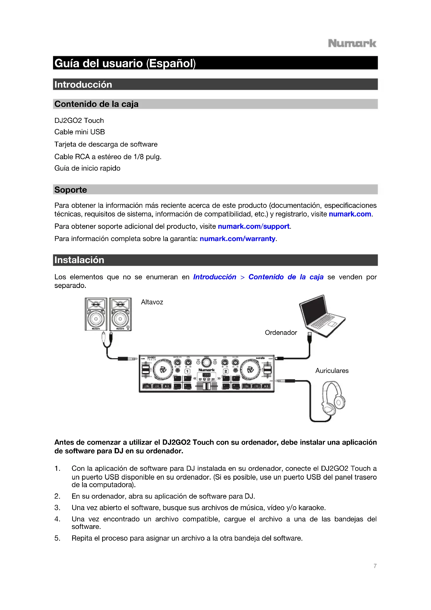 Guía del usuario (Español) Introducción Contenido de la caja DJ2GO2 Touch Cable mini USB Tarjeta de descarga de software Cable RCA a estéreo de 1/8 pulg. Guía de inicio rapido Soporte Para obtener la información más reciente acerca de este producto (documentación, especificaciones técnicas, requisitos de sistema, información de compatibilidad, etc.) y registrarlo, visite numark.com. Para obtener soporte adicional del producto, visite numark.com/support. Para información completa sobre la garantía: numark.com/warranty. Instalación Los elementos que no se enumeran en Introducción > Contenido de la caja se venden por separado.