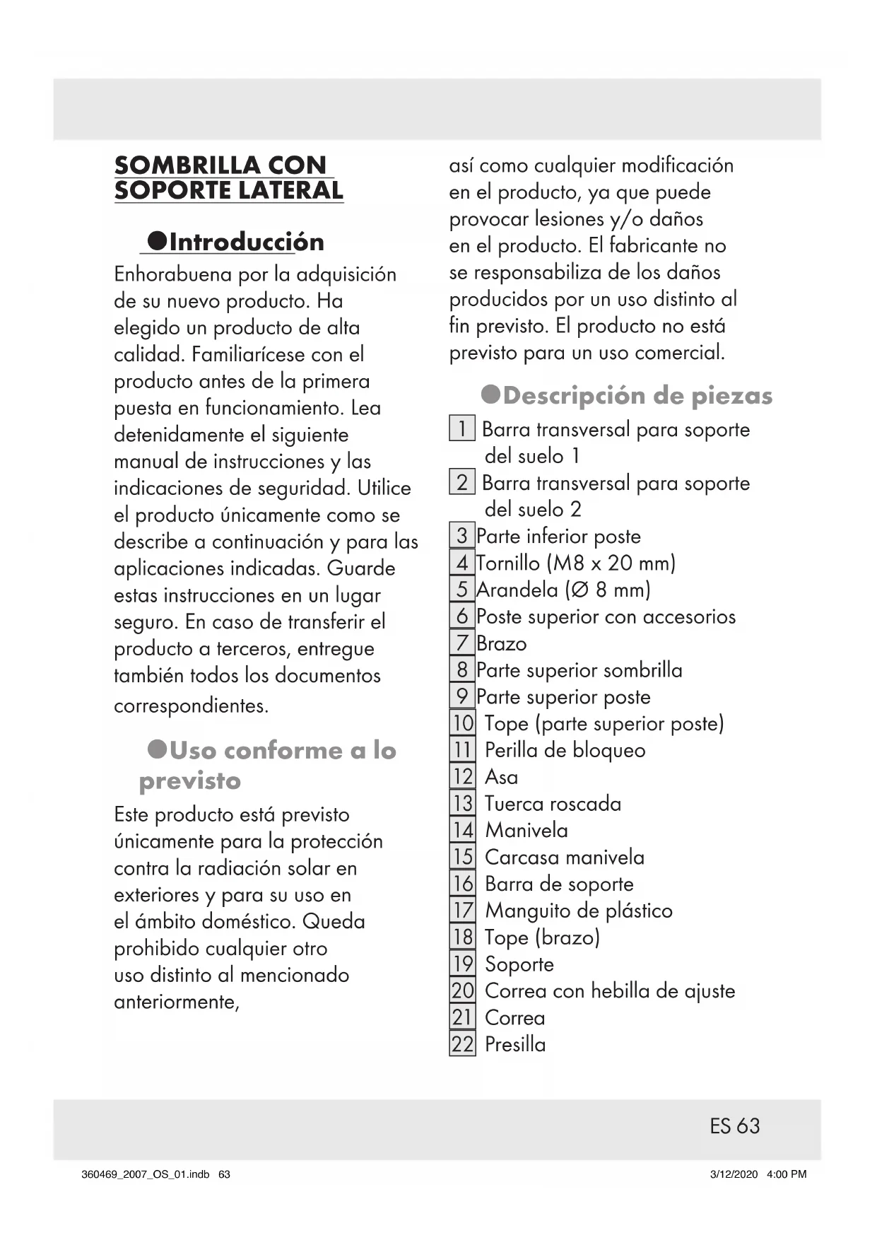 SOMBRILLA CON SOPORTE LATERAL Introducción Enhorabuena por la adquisición de su nuevo producto. Ha elegido un producto de alta calidad. Familiarícese con el producto antes de la primera puesta en funcionamiento. Lea detenidamente el siguiente manual de instrucciones y las indicaciones de seguridad. Utilice el producto únicamente como se describe a continuación y para las aplicaciones indicadas. Guarde estas instrucciones en un lugar seguro. En caso de transferir el producto a terceros, entregue también todos los documentos correspondientes. Uso conforme a lo previsto Este producto está previsto únicamente para la protección contra la radiación solar en exteriores y para su uso en el ámbito doméstico. Queda prohibido cualquier otro uso distinto al mencionado anteriormente, así como cualquier modificación en el producto, ya que puede provocar lesiones y/o daños en el producto. El fabricante no se responsabiliza de los daños producidos por un uso distinto al fin previsto. El producto no está previsto para un uso comercial. Descripción de piezas [1] Barra transversal para soporte del suelo 1 [2] Barra transversal para soporte del suelo 2 [3] Parte inferior poste [4] Tornillo (M8 x 20mm) [5] Arandela (Ø 8mm) [6] Poste superior con accesorios [7] Brazo [8] Parte superior sombrilla [9] Parte superior poste