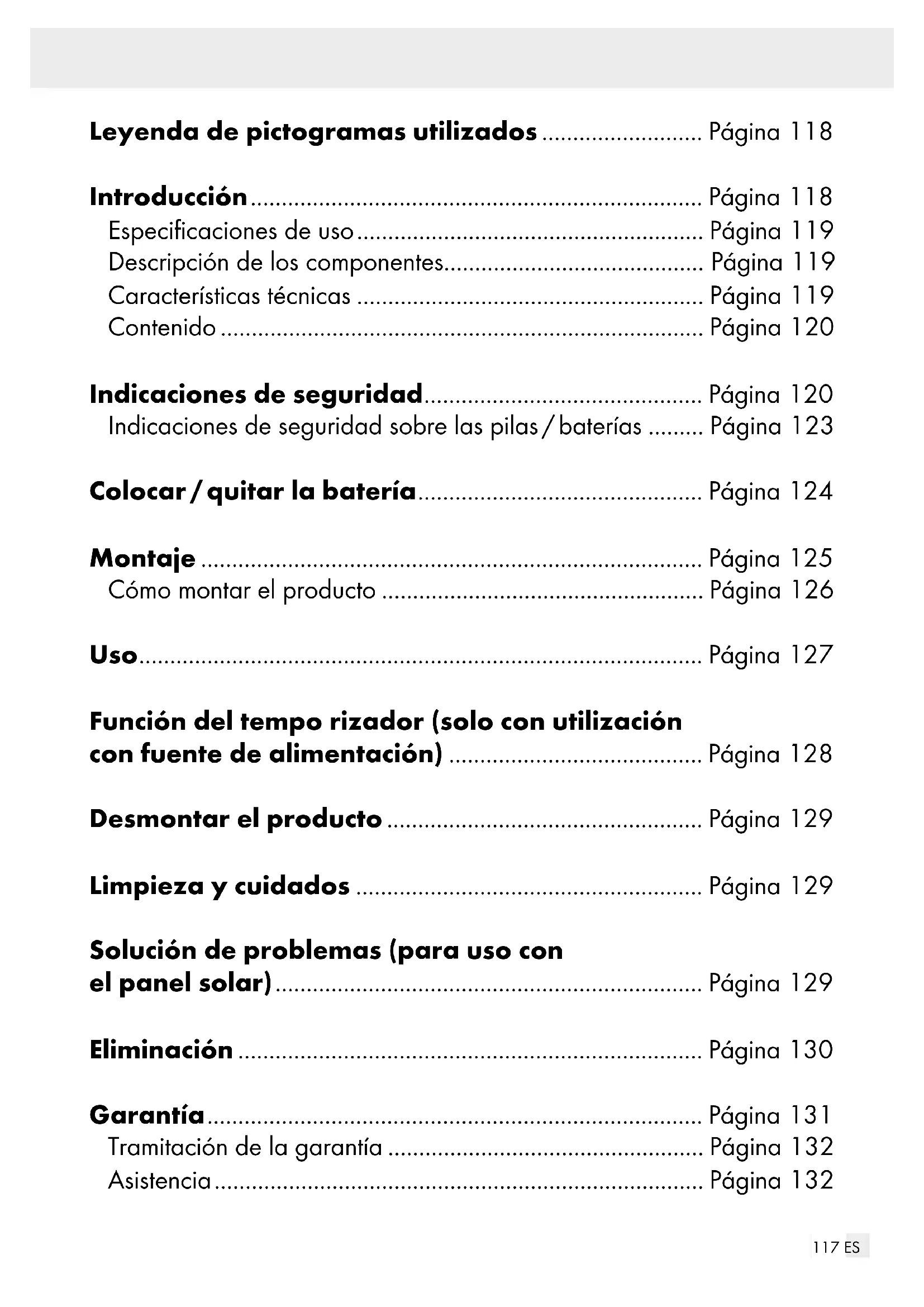 olución de problemas (para uso con el panel solar) Nota: El producto contiene com- ponentes electrónicos sensibles. Por ello, la proximidad de aparatos de radiotransmisión puede afectar al producto. En caso de detectar daños en el funcionamiento, retire las fuentes de interferencias del entorno del producto. Nota: Las cargas electrostáticas pueden producir fallos de funciona- miento. Si se dan tales fallos, retire unos instantes la batería e introdúz- cala de nuevo.130 ES Problema Causa Solución La luz no se enciende a pesar de que el pro- ducto ha recibido los rayos del sol todo el día. Las fuentes de luz artificial, como por ejemplo la luz de las farolas, interfieren con el producto. Monte el producto en un lugar donde no pueda verse afectado por otras fuentes lumi- nosas. La luz no se enciende o solo lo hace breve- mente. La batería está defec- tuosa o la luz del día no ha sido suficiente. Sustituya la batería o monte el producto en un lugar donde reciba más luz solar. Eliminación El embalaje está compuesto por materiales no contaminantes que pueden ser desechados en el cen- tro de reciclaje local.