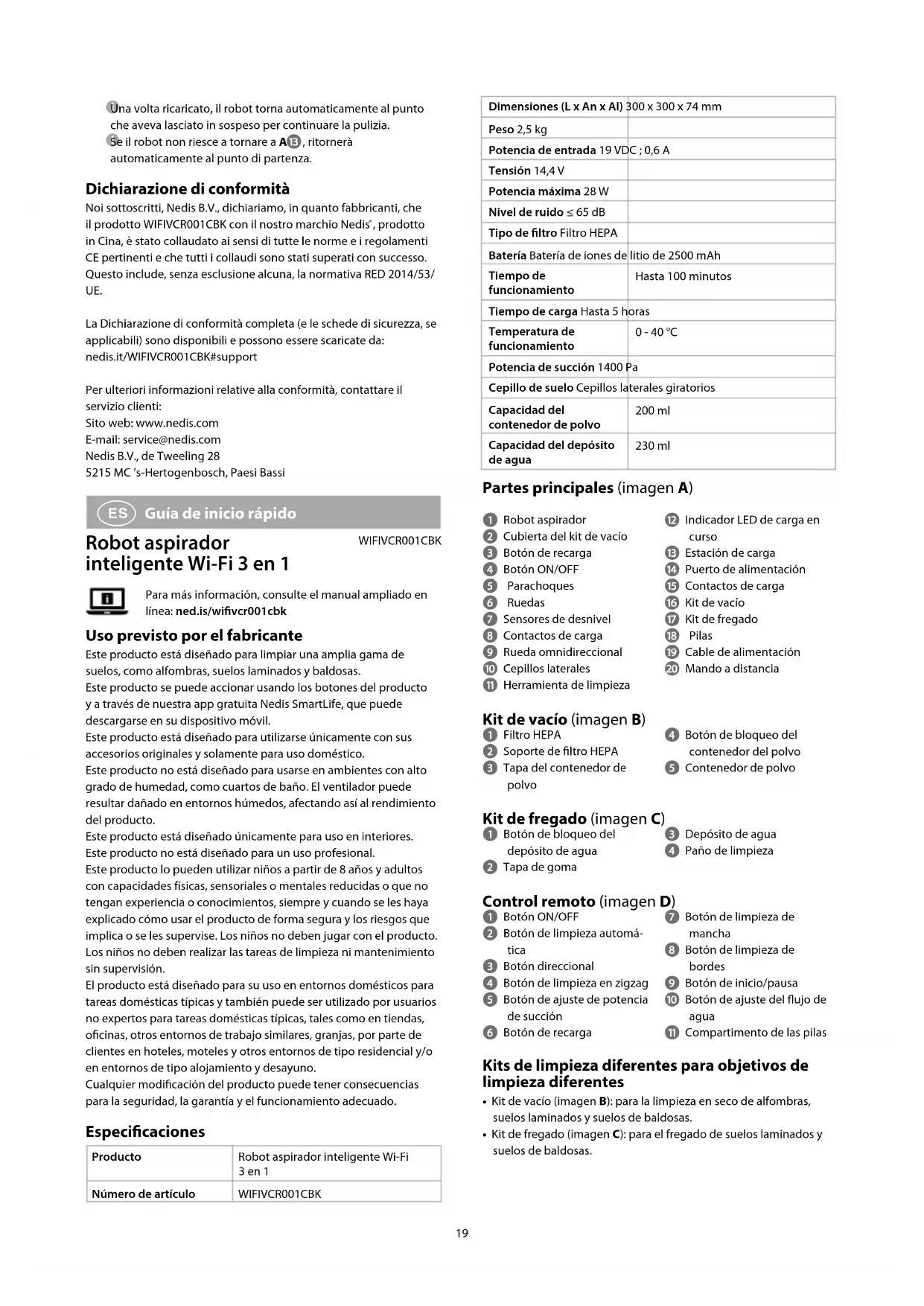 - Kit de vacío (imagen B): para la limpieza en seco de alfombras, suelos laminados y suelos de baldosas.• Kit de fregado (imagen C): para el fregado de suelos laminados y suelos de baldosas. Una volta ricaricato, il robot torna automaticamente al punto che aveva lasciato in sospeso per continuare la pulizia. Se il robot non riesce a tornare a A , ritornerà automaticamente al punto di partenza. Dichiarazione di conformità Noi sottoscritti, Nedis B.V., dichiariamo, in quanto fabbricanti, che il prodotto WIFIVCR001CBK con il nostro marchio Nedis , prodotto in Cina, è stato collaudato ai sensi di tutte le norme e i regolamenti CE pertinenti e che tutti i collaudi sono stati superati con successo. Questo include, senza esclusione alcuna, la normativa RED 2014/53/ UE. La Dichiarazione di conformità completa (e le schede di sicurezza, se applicabili) sono disponibili e possono essere scaricate da:nedis.it/WIFIVCR001CBK#supportPer ulteriori informazioni relative alla conformità, contattare il servizio clienti:Sito web: www.nedis.comE-mail: service@nedis.comNedis B.V., de Tweeling 285215 MC ’s-Hertogenbosch, Paesi Bassi
