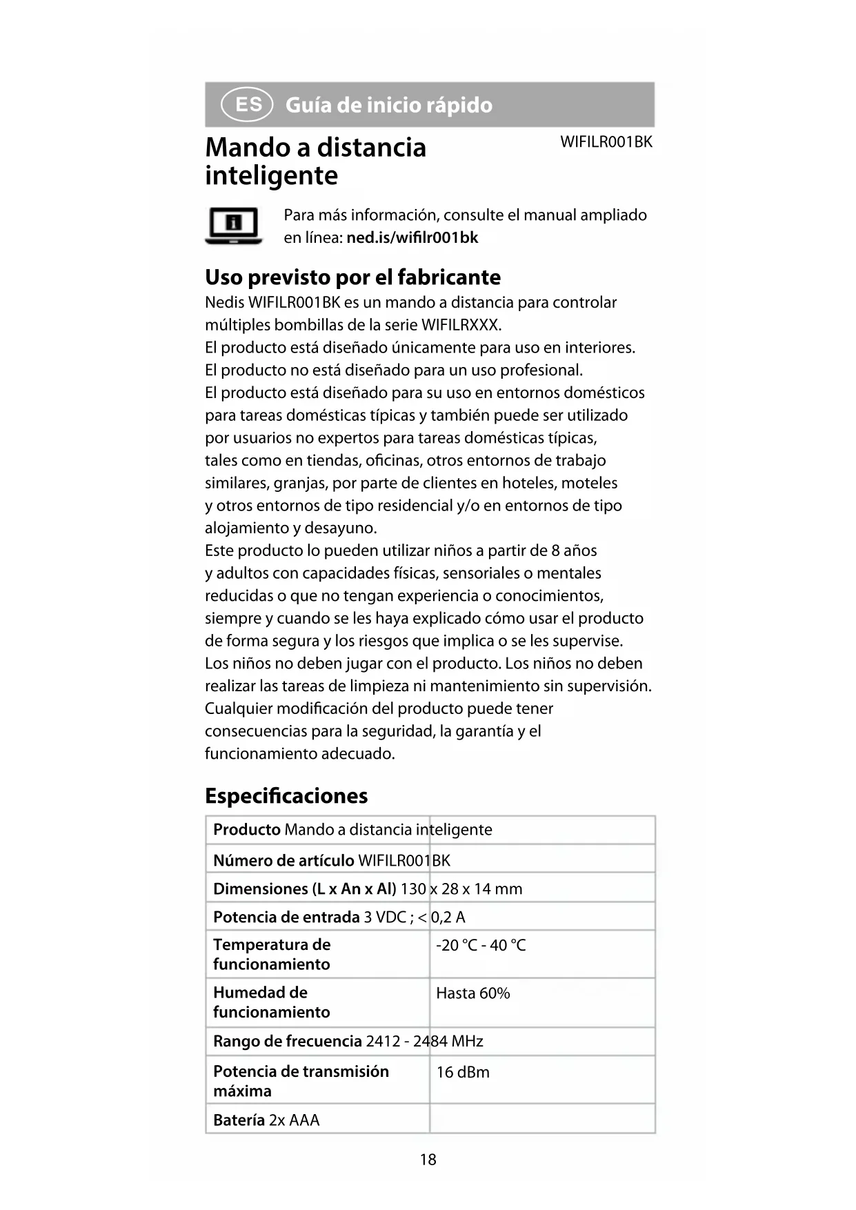 Guía de inicio rápido Mando a distancia inteligente WIFILR001BK Para más información, consulte el manual ampliado en línea: ned.is/wilr001bk Uso previsto por el fabricante Nedis WIFILR001BK es un mando a distancia para controlar múltiples bombillas de la serie WIFILRXXX. El producto está diseñado únicamente para uso en interiores. El producto no está diseñado para un uso profesional. El producto está diseñado para su uso en entornos domésticos para tareas domésticas típicas y también puede ser utilizado por usuarios no expertos para tareas domésticas típicas, tales como en tiendas, ocinas, otros entornos de trabajo similares, granjas, por parte de clientes en hoteles, moteles y otros entornos de tipo residencial y/o en entornos de tipo alojamiento y desayuno. Este producto lo pueden utilizar niños a partir de 8 años y adultos con capacidades físicas, sensoriales o mentales reducidas o que no tengan experiencia o conocimientos, siempre y cuando se les haya explicado cómo usar el producto de forma segura y los riesgos que implica o se les supervise. Los niños no deben jugar con el producto. Los niños no deben realizar las tareas de limpieza ni mantenimiento sin supervisión. Cualquier modicación del producto puede tener consecuencias para la seguridad, la garantía y el funcionamiento adecuado. Especicaciones Producto Mando a distancia inteligente Número de artículo WIFILR001BK Dimensiones (L x An x Al) 130 x 28 x 14 mm Potencia de entrada 3 VDC ; < 0,2 A Temperatura de funcionamiento -20 °C - 40 °C Humedad de funcionamiento Hasta 60% Rango de frecuencia 2412 - 2484 MHz Potencia de transmisión máxima 16 dBm Batería 2x AAA19 Partes principales (imagen A) 1 Indicador LED 2 Botón de encendido 3 Reducir el brillo 4 Botón de apagado 5 Aumentar el brillo 6 Compartimento de las pilas Instrucciones de seguridad