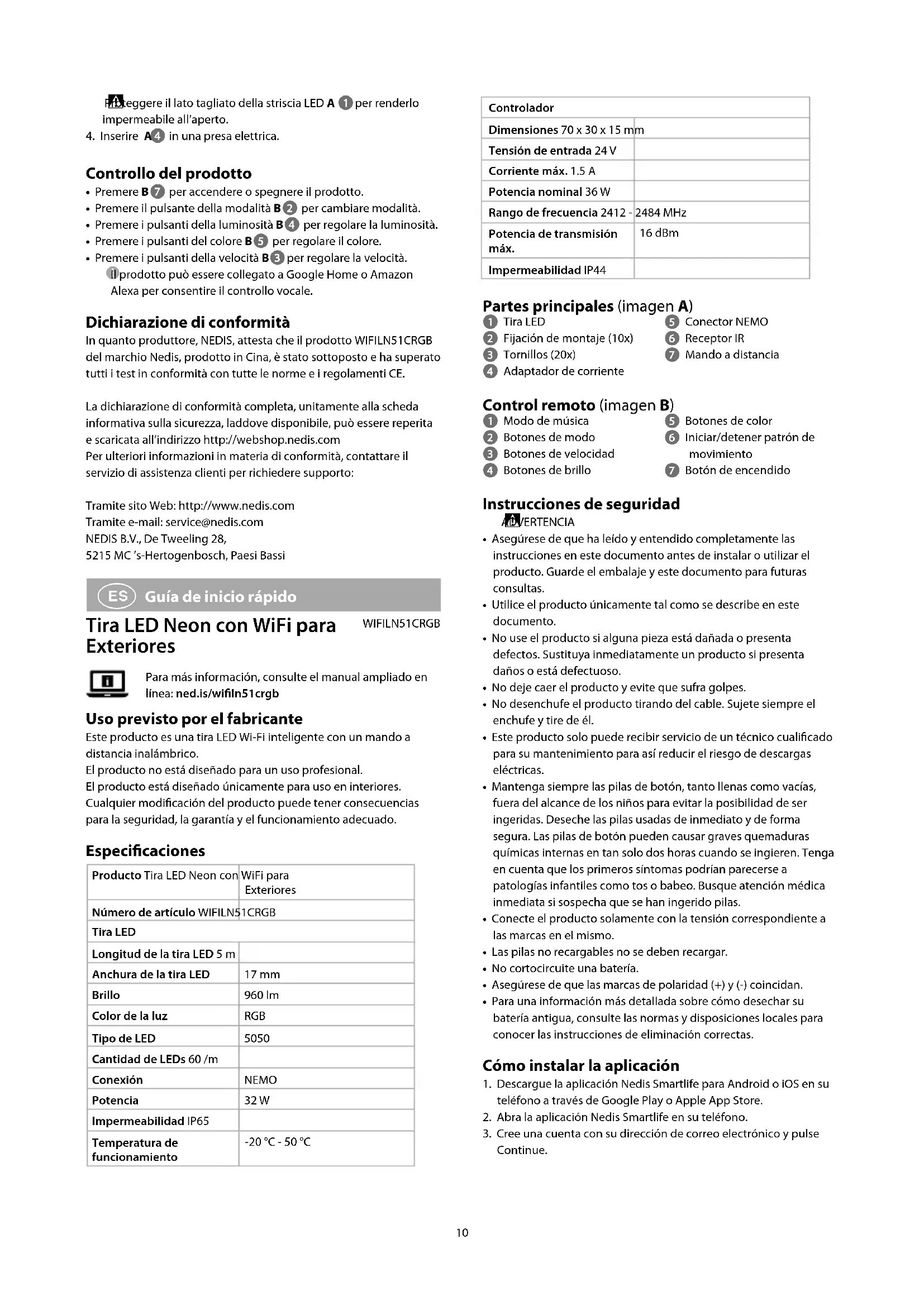 - Pulse B para encender o apagar el producto.• Pulse el botón de modo B para cambio los modos.• Pulse los botones de brillo B para ajustar el brillo.• Pulse los botones de color B para ajustar el color.• Pulse los botones de velocidad B para ajustar la velocidad. El producto se puede conectar a Google Home o a Amazon Alexa para habilitar el control de voz. Declaración de conformidad Nosotros, NEDIS, como fabricante, declaramos que el producto WIFILN51CRGB de la marca Nedis, producido en China, se ha sometido a pruebas en conformidad con todas las normativas / leyes CE, y ha superado todos los ensayos.La declaración de conformidad completa y la hoja de datos de seguridad, si procede se pueden consultar y descargar en http://webshop.nedis.comPara acceder a otra información sobre compatibilidades, póngase en contacto con el servicio de atención al cliente:en el sitio web: http://www.nedis.comen el correo electrónico: service@nedis.comNEDIS B.V., De Tweeling 28,5215 MC ’s-Hertogenbosch, PAÍSES BAJOS12